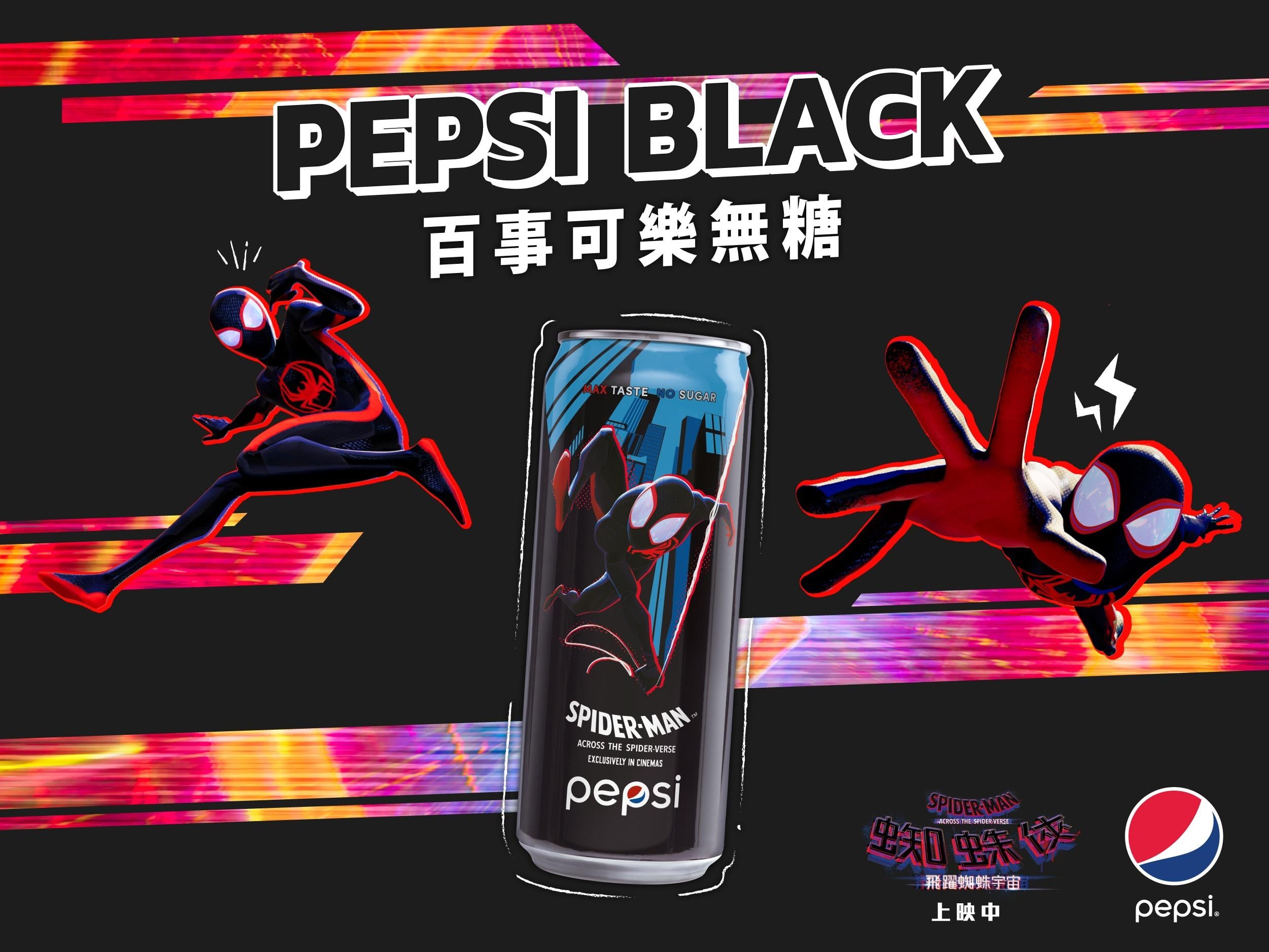 《蜘蛛俠:飛躍蜘蛛宇宙》今夏登場,動畫講述穿梭於紐約布魯克林大街小巷守護居民的「蜘蛛俠」麥爾斯,跟桂恩史德西重逢後,被神秘力量帶領進入一個充滿各式各樣「蜘蛛俠」的多元宇宙的一系列故事。百事可樂無糖的型格黑罐刻上「蜘蛛俠」躍動的電影造型,充滿動感,極具收藏價值,一眾Marvel及蜘蛛俠記得入手。