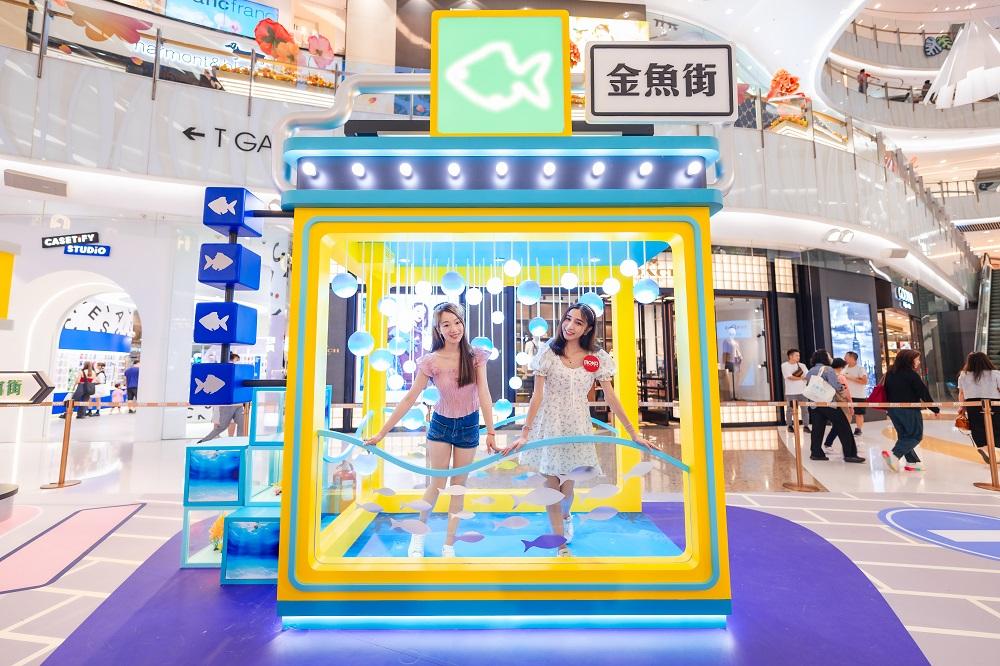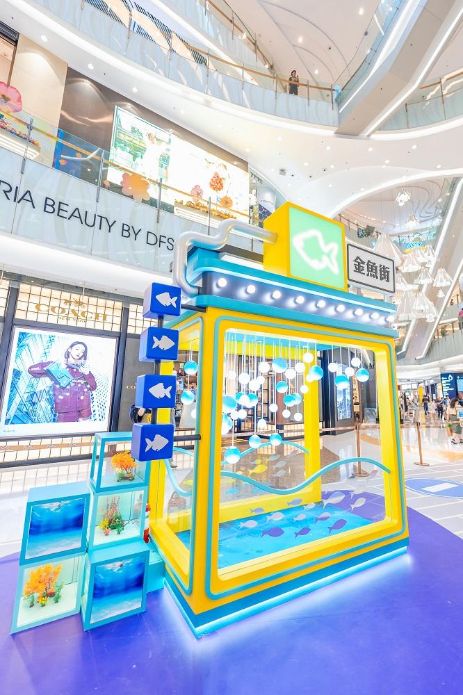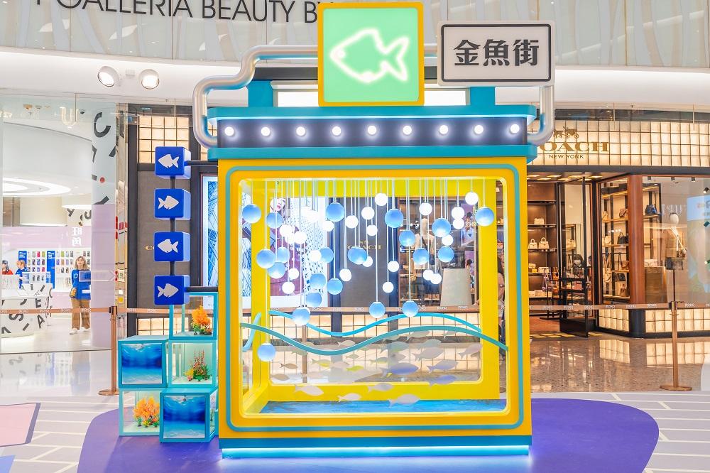 走過「雀仔街」及「花墟」,以迷幻閃爍波浪及魚群裝飾而成的3米高巨大魚缸立即映入眼簾!通透的裝置加上藍白波波吊燈明淨透亮地閃耀著,營造出波光粼粼的效果,令人宛若置身海底!魚缸旁綴以翠綠水草植物造景的魚缸不規則地高低架疊,將水族景觀延伸,讓訪客盡享視覺之感,投入清涼迷人的水族世界。