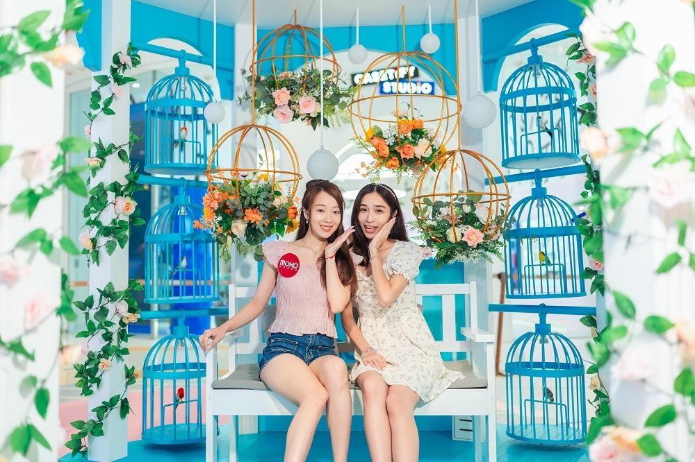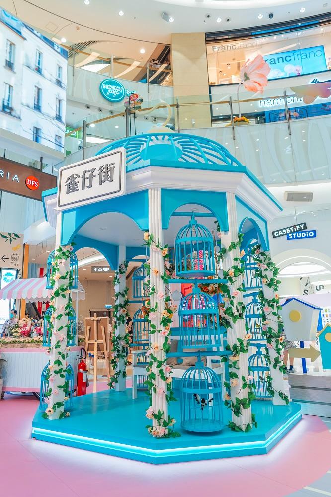 4米高粉藍色巨型八角鳥籠裝置聳立場中,柱身配以絢麗花卉佈置,籠邊掛上12個小鳥籠相互襯托,仙氣滿溢,以現代風格呈現「雀仔街」特色。訪客必定要安坐鳥籠中,背靠小清新花球吊飾及在彩燈照耀下打卡,浪漫非常!鳥籠裝置旁更堆滿了玫瑰、鬱金香、滿天星、梔子花等色彩繽紛的花卉,美不勝收,令人心曠神宜。「夢幻花鳥園」把廣闊的花鳥世界濃縮在一個場景中,讓訪客以嶄新的角度欣賞本土文化及一次過盡情打卡。