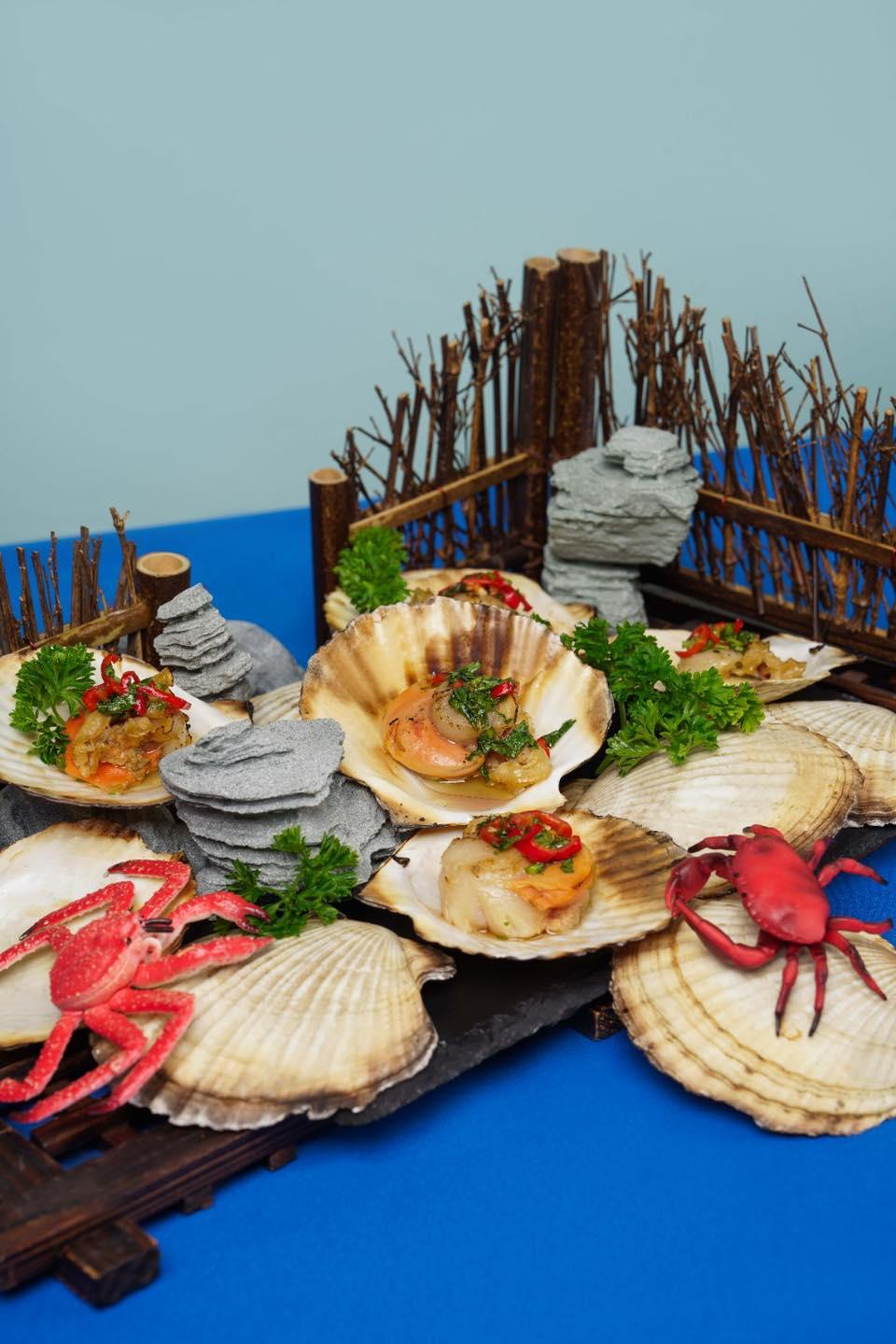 除招牌的海鮮冷盤如生蠔、松葉蟹腳、波士頓龍蝦鉗、麵包蟹、小龍蝦、海蝦及翡翠螺等在不同時段供應,當然不少得一系列環球海鮮美饌,特別搜羅世界各地的時令海鮮炮 製,焦點菜式包括即蒸活波士頓龍蝦、泰式青檸蒸魚、辣椒芫茜烤扇貝、韓式火焰卜卜蜆及清酒香草牛油蒸青口等輪流上場,品嚐不同風味的海鮮美食!