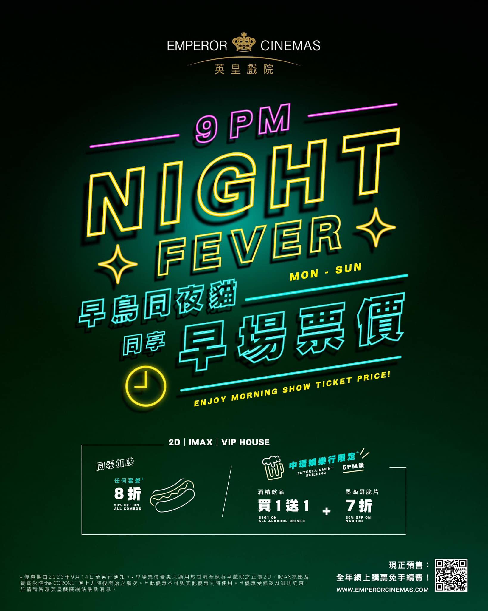 英皇戲院Emperor Cinemas 宣布,由即日起,星期一至日的晚上9時後,無論是正價2DIMAX戲票及貴賓影院the CORONET,睇戲同早場一樣票價,另外小食套餐都有優惠。