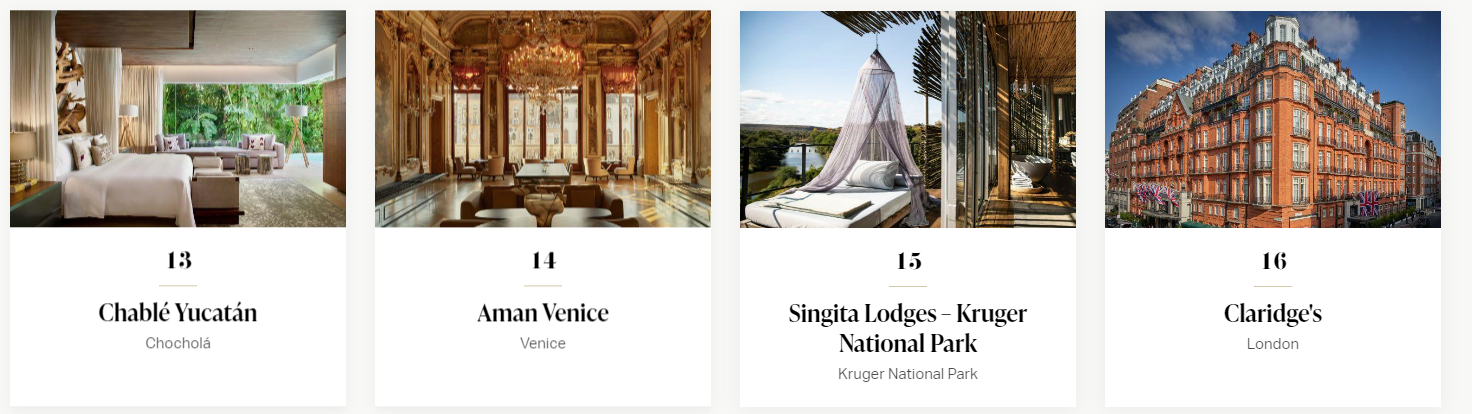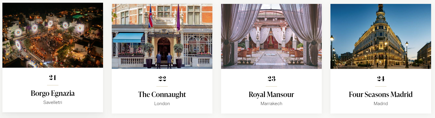 歐洲地區共21間酒店上榜,其中倫敦就有四間: Claridge's (第16)、 The Connaught(第22)、 NoMad London(第46)和The Savoy (第47)。