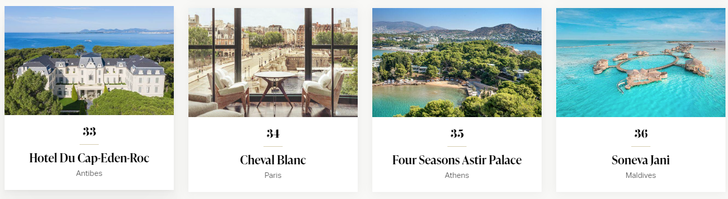 前10名當中有6間位處亞洲,除了兩間香港酒店外,還有曼谷湄南河四季酒店(第3),安縵東京酒店(第5)、馬爾代夫索尼娃富士度假村Soneva Fushi(第7)、曼谷文華東方酒店(第10)。