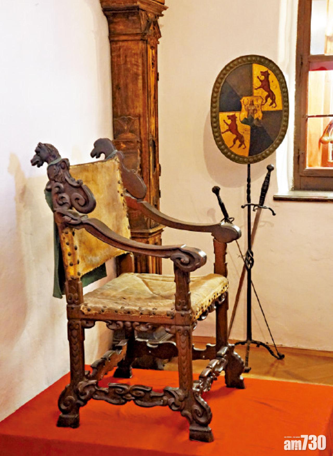 伯爵帶我們參觀城堡,來到一角指著古老座椅說,祖先們均善於騎術,曾祖父由於太喜歡馬,愛駒死後,把皮毛做成坐墊,每天有如騎在馬背。城堡的存在可追溯到1149年,當年已是巨大堡壘,兩座高40米塔樓保留至今。