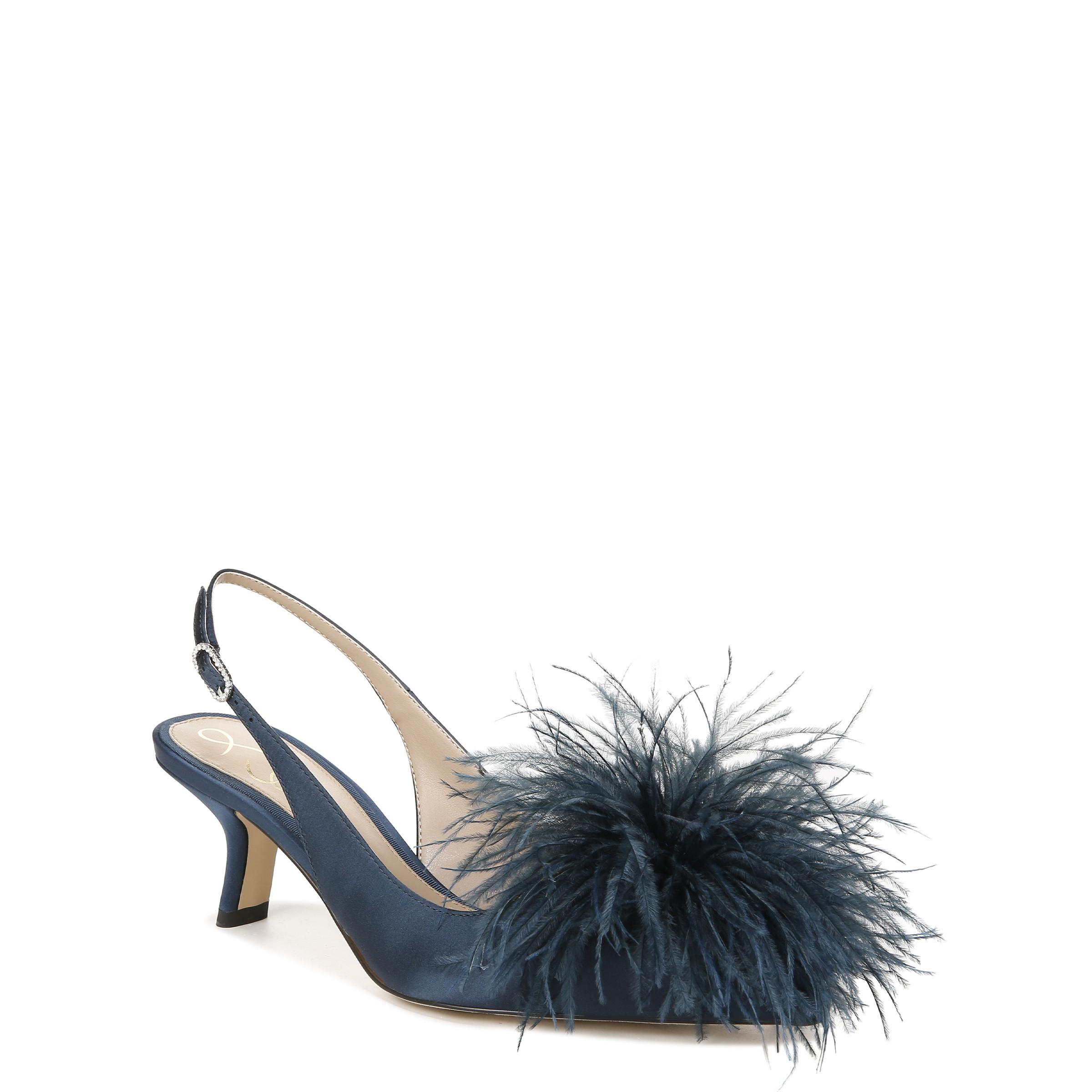 BIANKA羽毛後踝帶跟鞋輕盈細長羽毛組成的放射狀毛球,隨每步飄逸舞動。纖幼腳跟背帶配上金屬扣,作出高雅點綴,展露性感與佻皮。