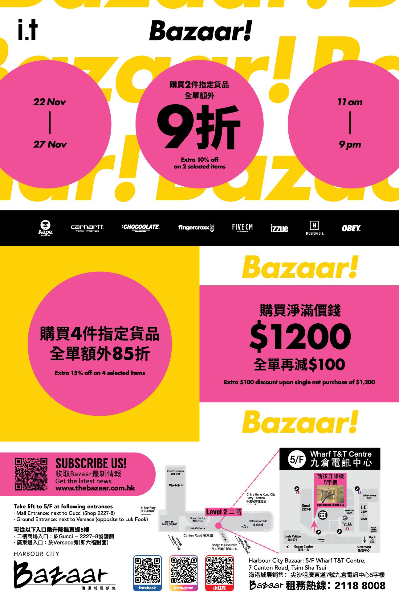 尖沙咀海港城,由即日起至11月27日推廣潮店i.t 開倉outlet,2件9折、4件85折、買滿$1,200全單再減$100。