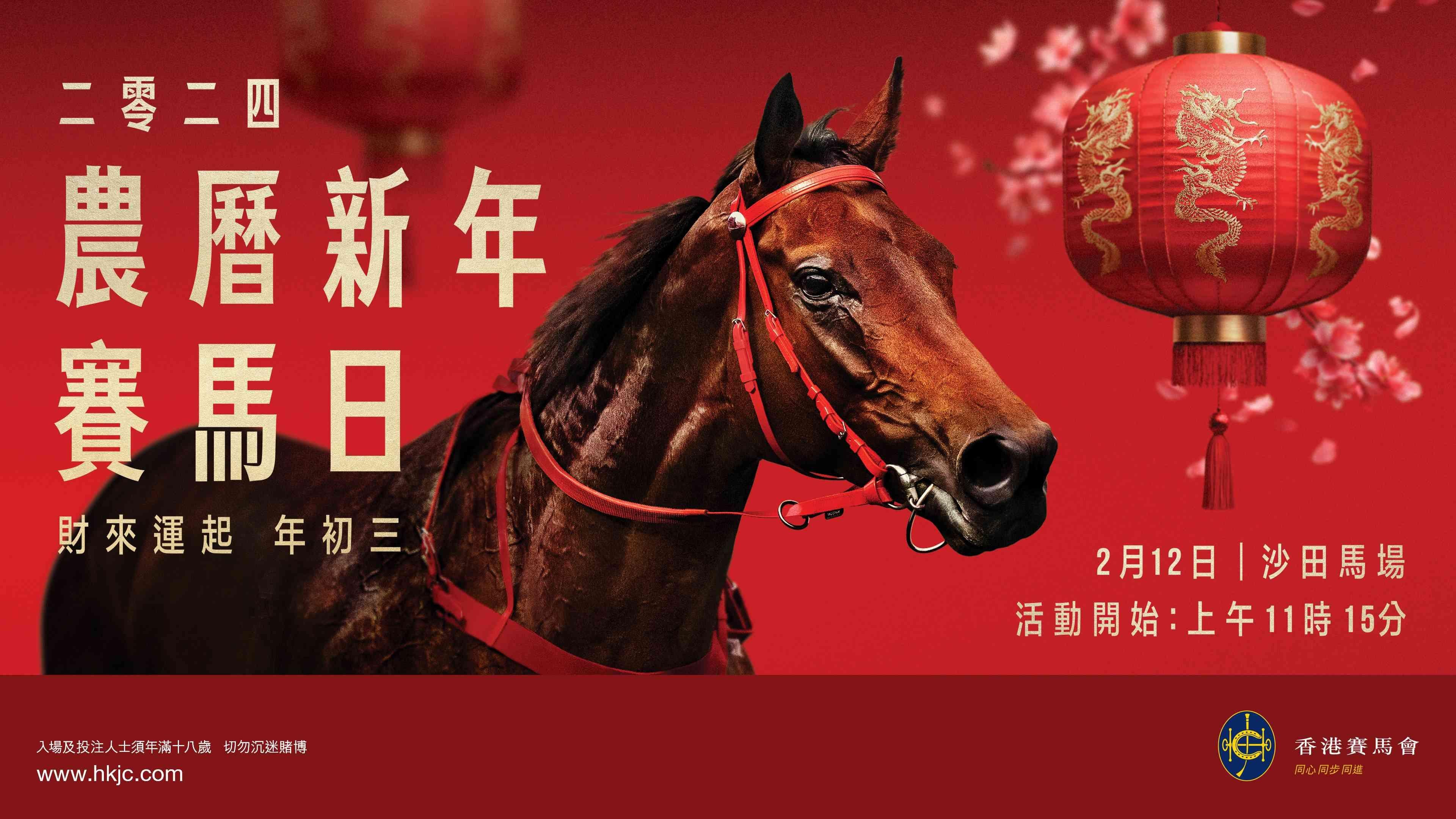 甲辰龍年伊始,香港賽馬會將於大年初三(2024年2月12 日)「農曆新年賽馬日」於沙田馬場舉行十一場精彩賽事,除了焦點賽事《賀年盃》外,更有賀年綜合匯演及慶節主題美饌,與市民共度一個財運亨通的農曆新年!今年大會更準備6大賀年「發」寶帶領大家遊走馬場,除了「沙田馬場日日賞」有獎問答遊戲,大會更會發放高達1億3千8百萬元的農曆新年大賞。一系列的賀年活動即將準備就緒,各位不妨於大年初三到沙田馬場行大運,迎接新一年的財運福氣,齊齊財來運起年初三!