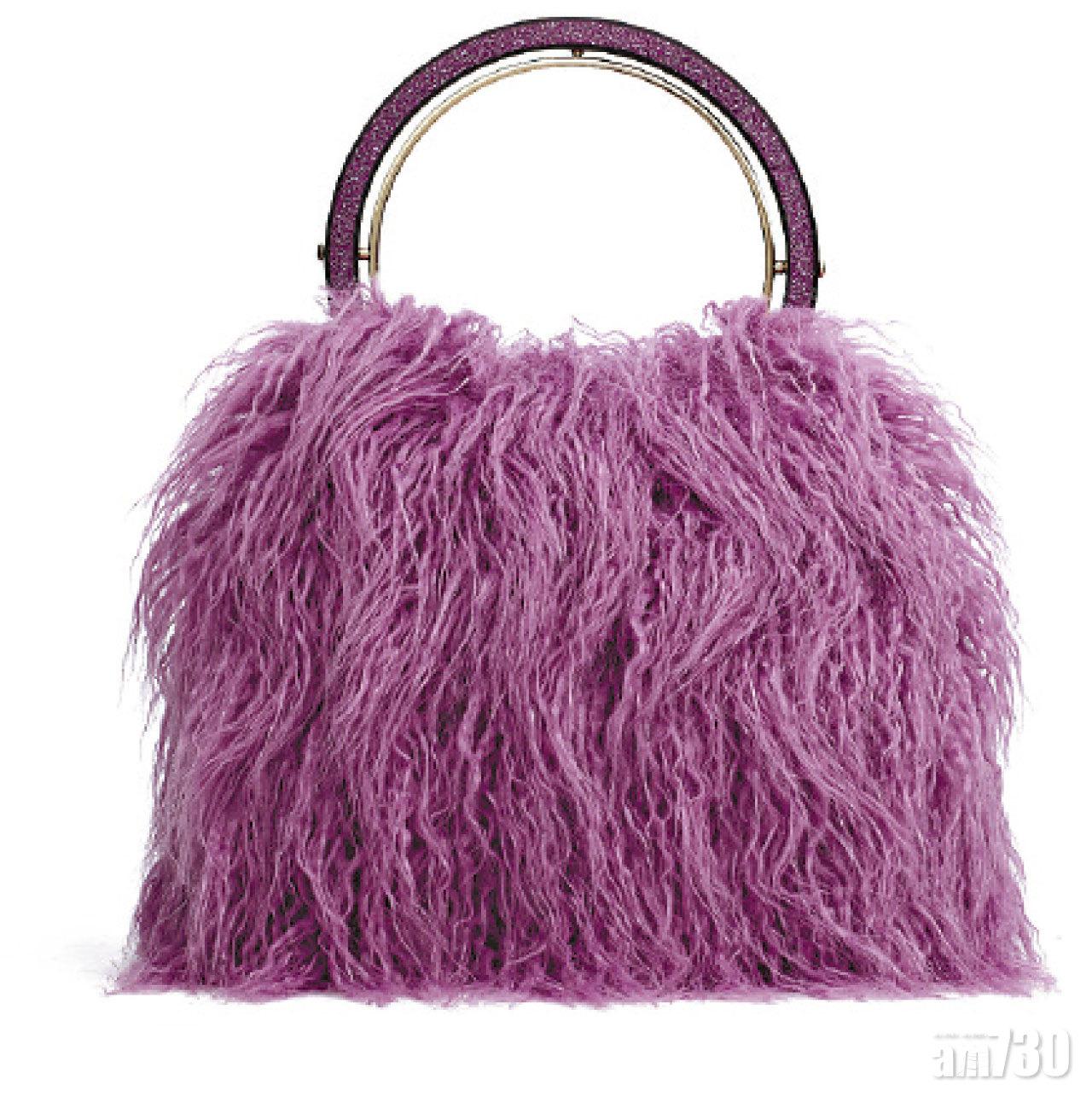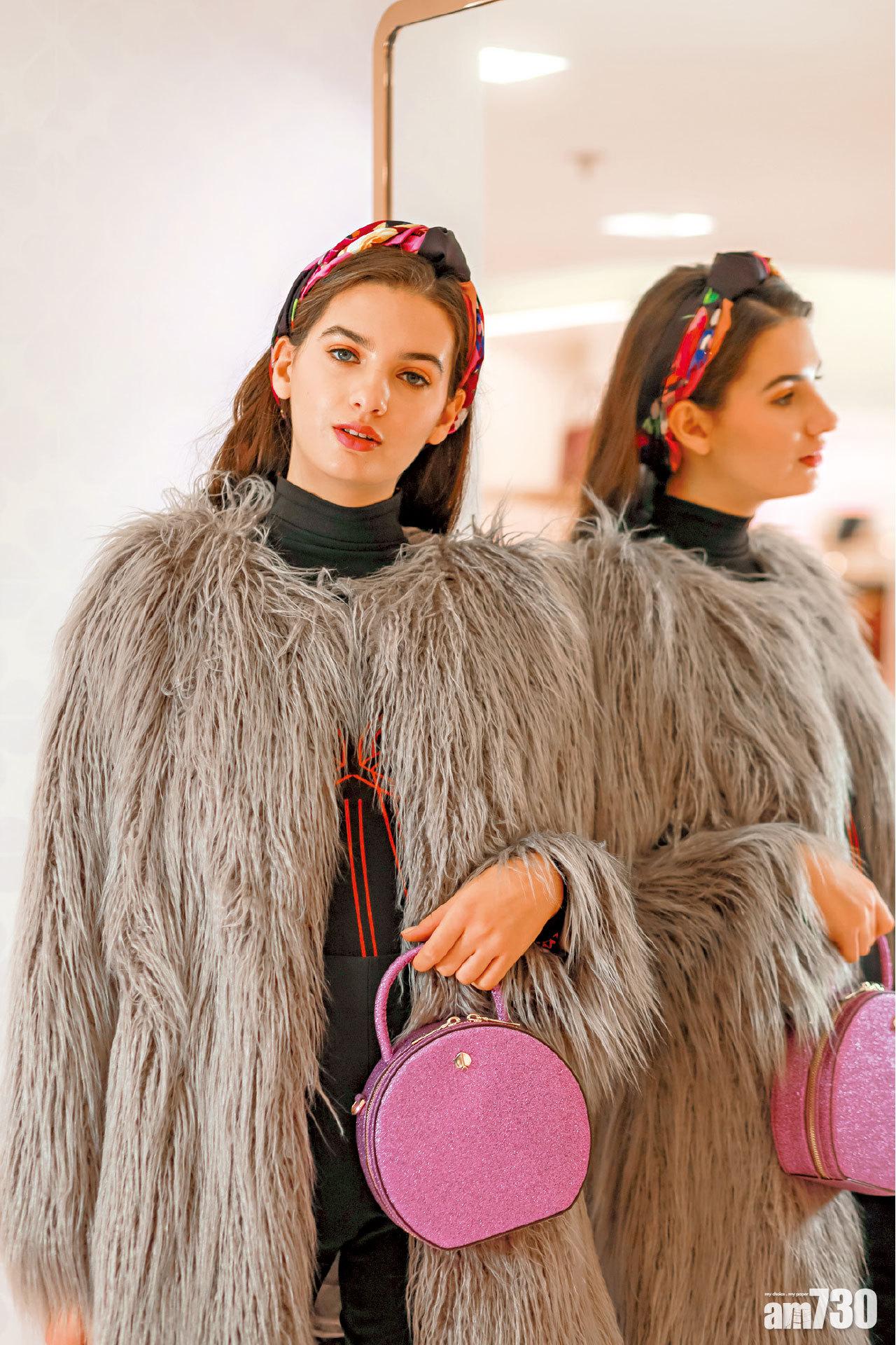 灰毛毛大褸 $6,900 (a); 黑色樽領Theresa String Body $3,090 (d); 紫色閃粉圓形手挽袋 $3,200 (a); 彩色印花絲巾(as headband) 售價待定 (a)
