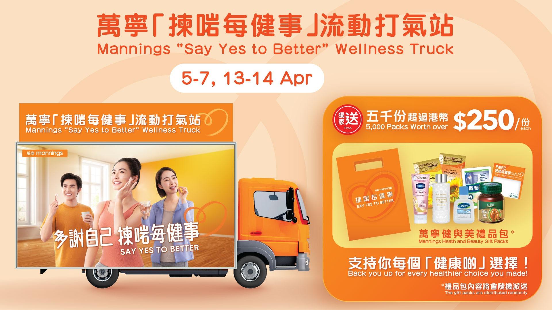 萬寧為鼓勵市民追求健康生活,推出全新「揀啱每健事」企劃,包括宣傳片、大型戶外廣告、線上及線下推廣和購物優惠等,更會於4月5至7日及13至14日設置「揀啱每健事」流動打氣站,遊走港九新界多個地區,設有獎小遊戲,大派5,000份價值逾$250的萬寧健與美禮品包,送出白蘭氏蟲草雞精Cs-4配方、森下仁丹Bifina Si晶球益生菌、AHC超水感淨亮涼感防曬精華等保健、美容、個人護理精選好物。