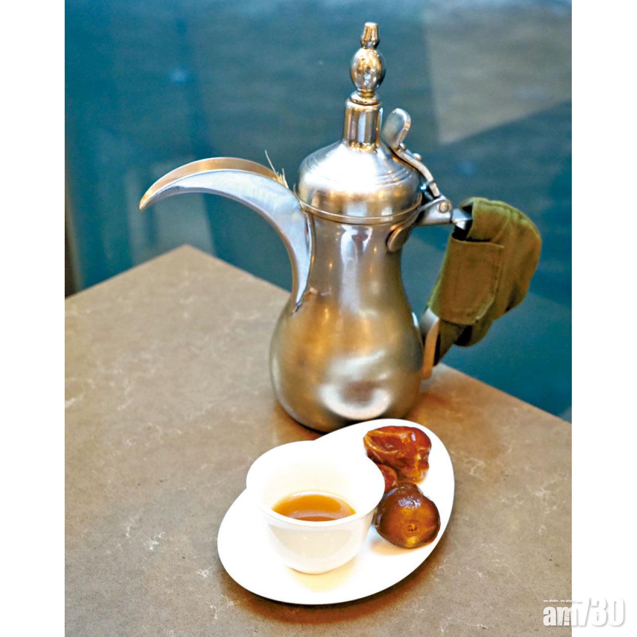 阿拉伯咖啡,味道濃郁苦澀,但帶有淡淡豆蔻香,初喝不習慣,但越喝越愛,佐以椰棗更佳。AED 30