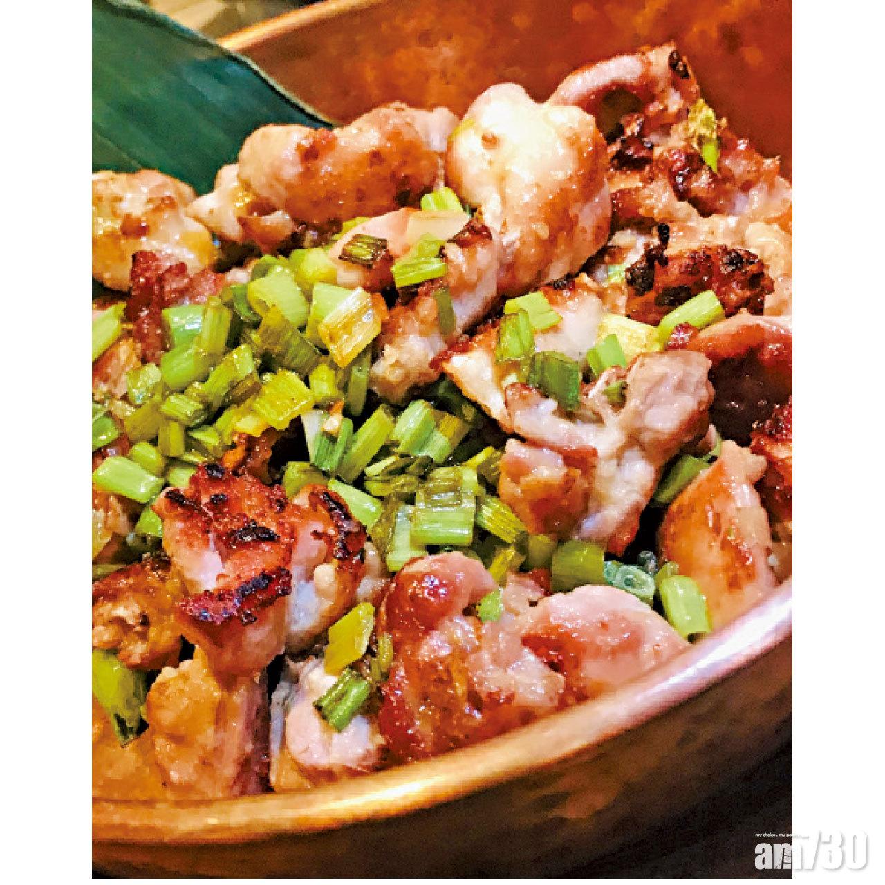 順德名菜中以銅盤生煎的走地雞,煎得金黃的雞件非常入味,翠綠蔥粒更是大過主人婆的綠葉。