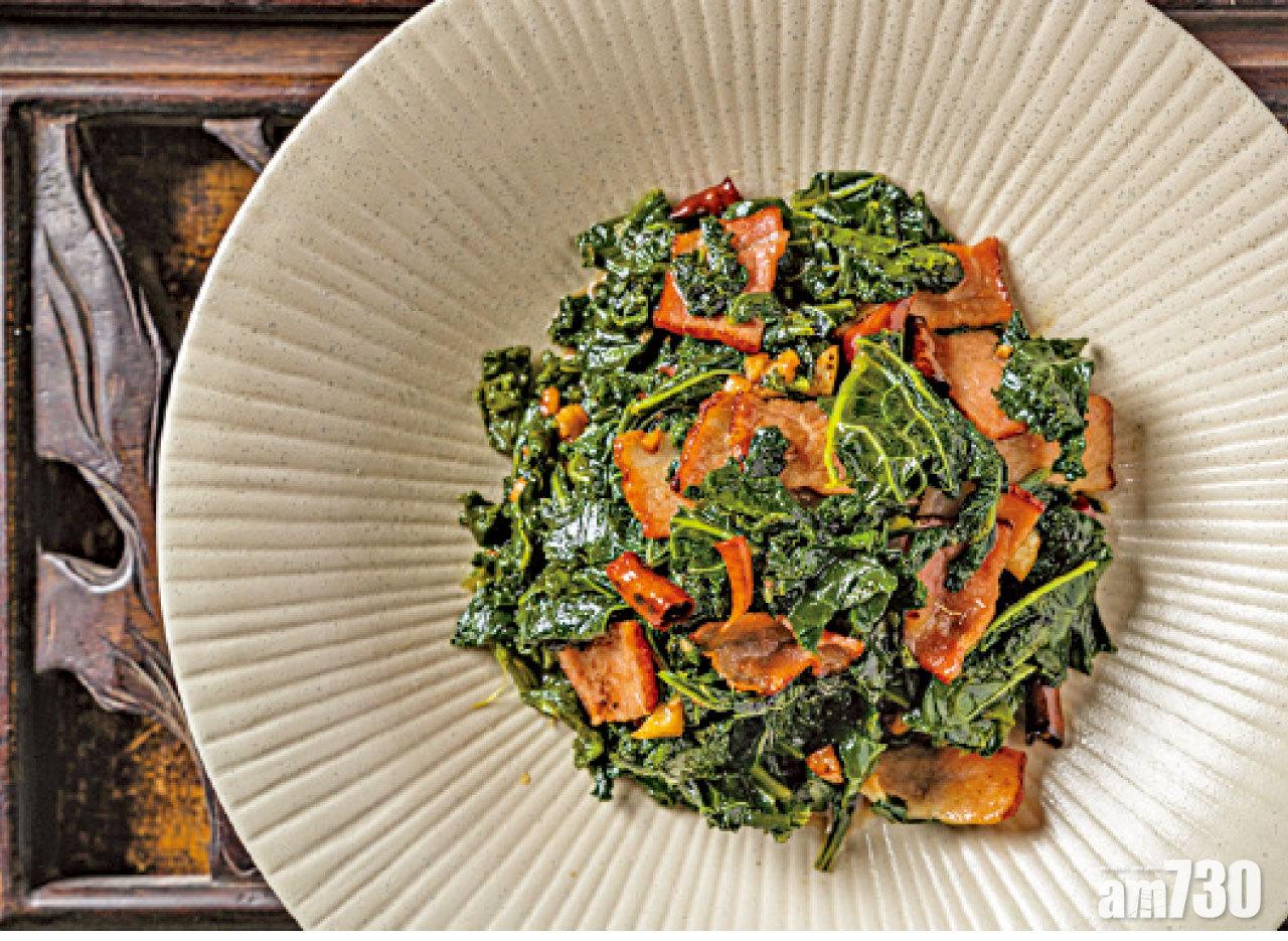 健康界大熱羽衣甘藍偏硬帶苦澀,當沙律其實不太易入口,大廚混入風味十足的雲南臘肉一同爆炒,羽衣甘藍變得平易近人更滋味,亦與臘肉的厚重互相制衡。