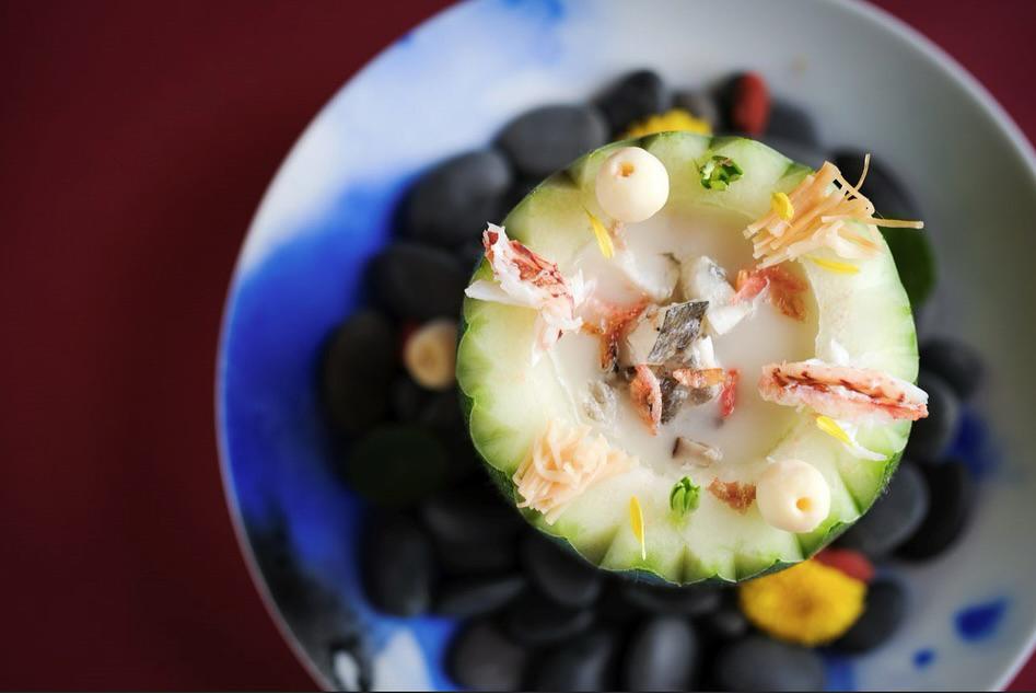 唐人館╳閩東壹魚的菜單中,以粵菜的烹調手法炮製大黃魚,包括「古法原條海釣大黃魚伴手工陳村粉」、「潮州半煎煮原條海釣大黃魚」、「原隻冬瓜盅燒海釣大黃魚花膠羹」等,把閩東壹魚的一抹金麟色帶到桌上,愛吃魚的絕不能錯過。大黃魚套餐午市$758、晚市$1,388。