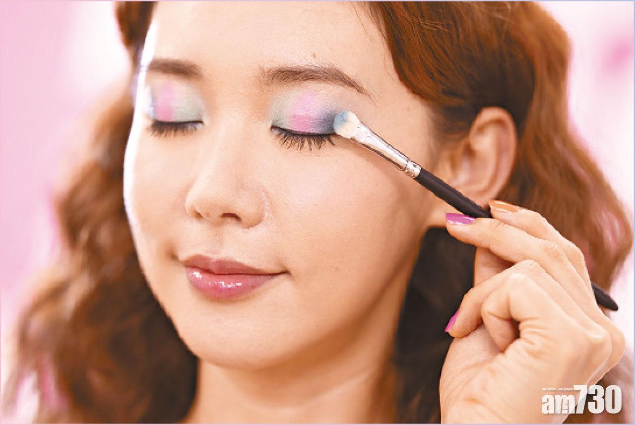 Step3: 眼妝用上粉色系的五色眼影,在眼頭至眼尾分別用上淺綠、粉紅及湖水藍色,中間過度位置以化妝掃blend開。下眼頭點上中間的淺藍色,打亮眼頭,營造色彩繽紛的眼妝。