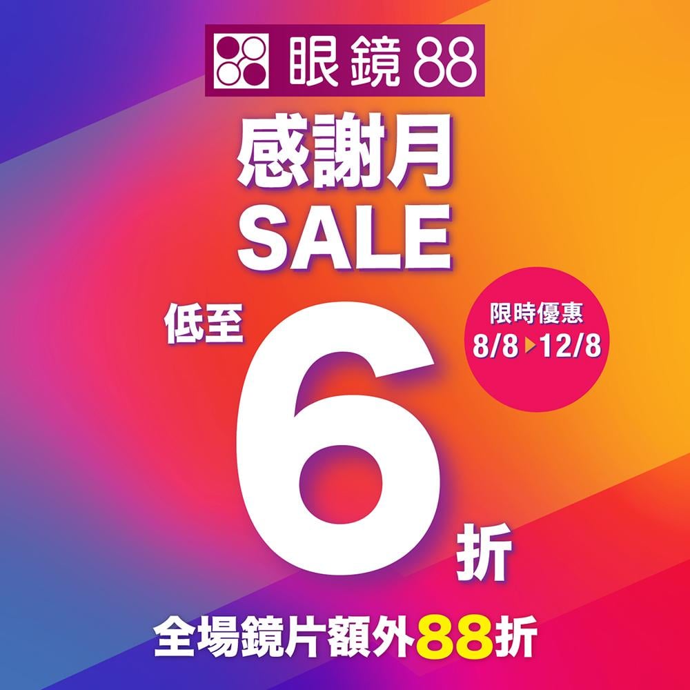 眼鏡88門市將於即日起至12日一連5日舉行感謝月限時低至6折優惠,全場鏡片更額外88折,把握機會,實現折上折優惠!
