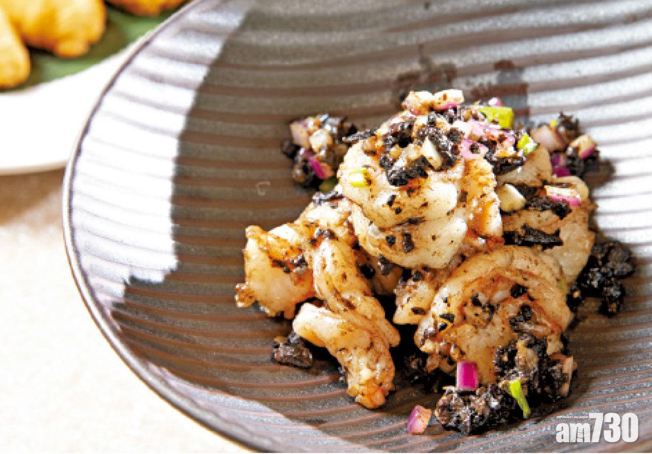 欖角蝦球,欖角用紹興酒爆香,再加青蔥、洋蔥、乾蔥重複爆炒,最後放蝦球再炒,帶醉的欖角再把蝦鮮提升。$158