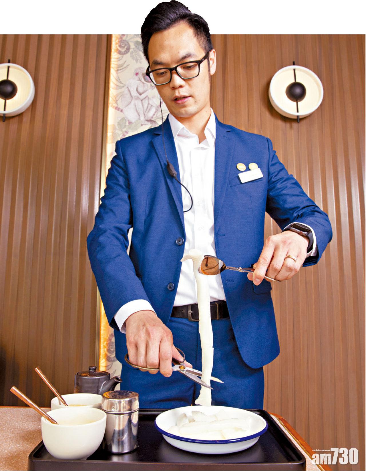 鉸剪腸粉,懷舊街頭景象登堂入室,侍應先在碟上鋪牛油紙塗生油,然後拿起鐵鉸剪「嚓、嚓、嚓」,手起剪落,將長長布拉腸粉剪成小塊,再澆上豉油、麻醬、甜醬、辣醬、芝麻。$33