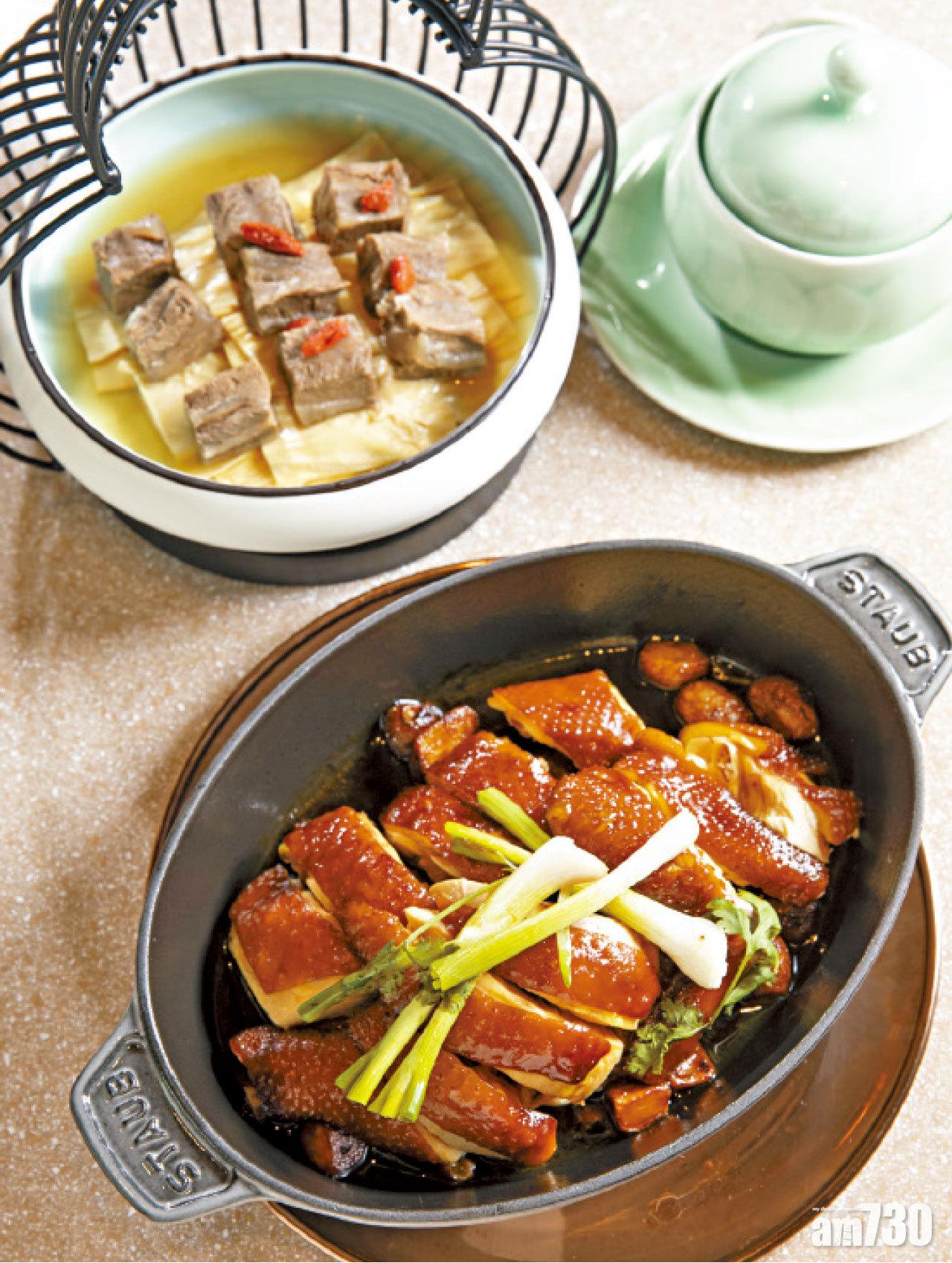 花雕瓦罉豉油雞,豉油雞用已加熱醬油浸熟,上菜時再加以花雕燒煮,令酒香滲入滑溜雞肉裡面。$158