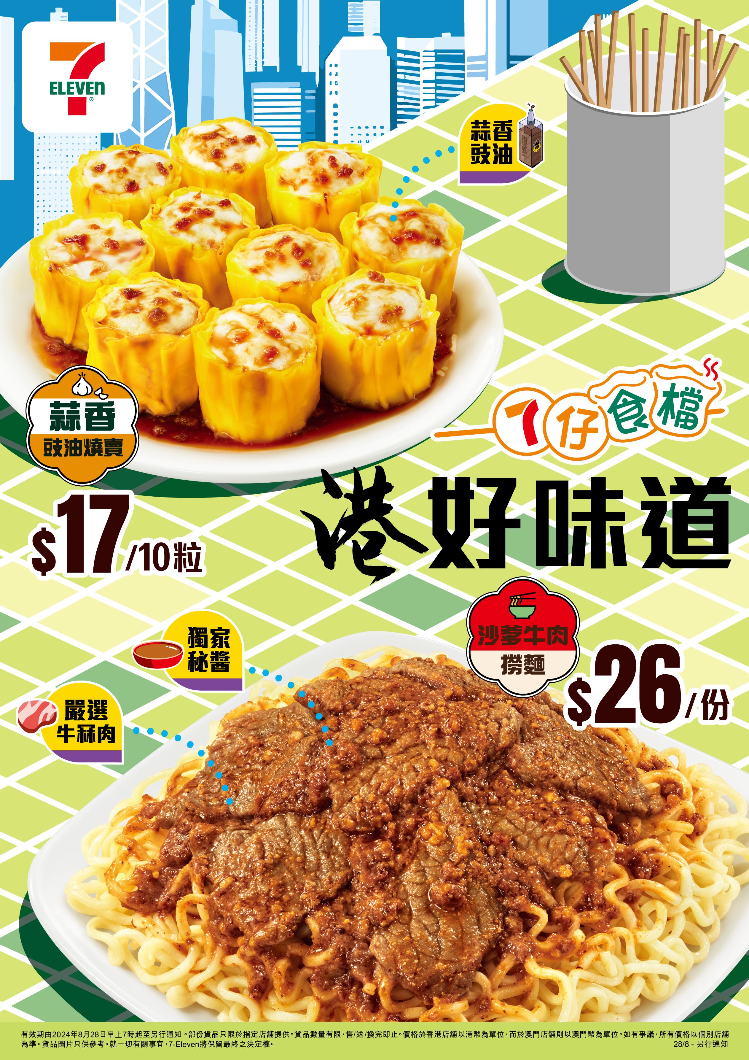如果想試全新獨家配方蒜香豉油燒賣及獨家秘醬沙爹牛肉撈麵,即日起就可於全線「7仔食檔」食到。