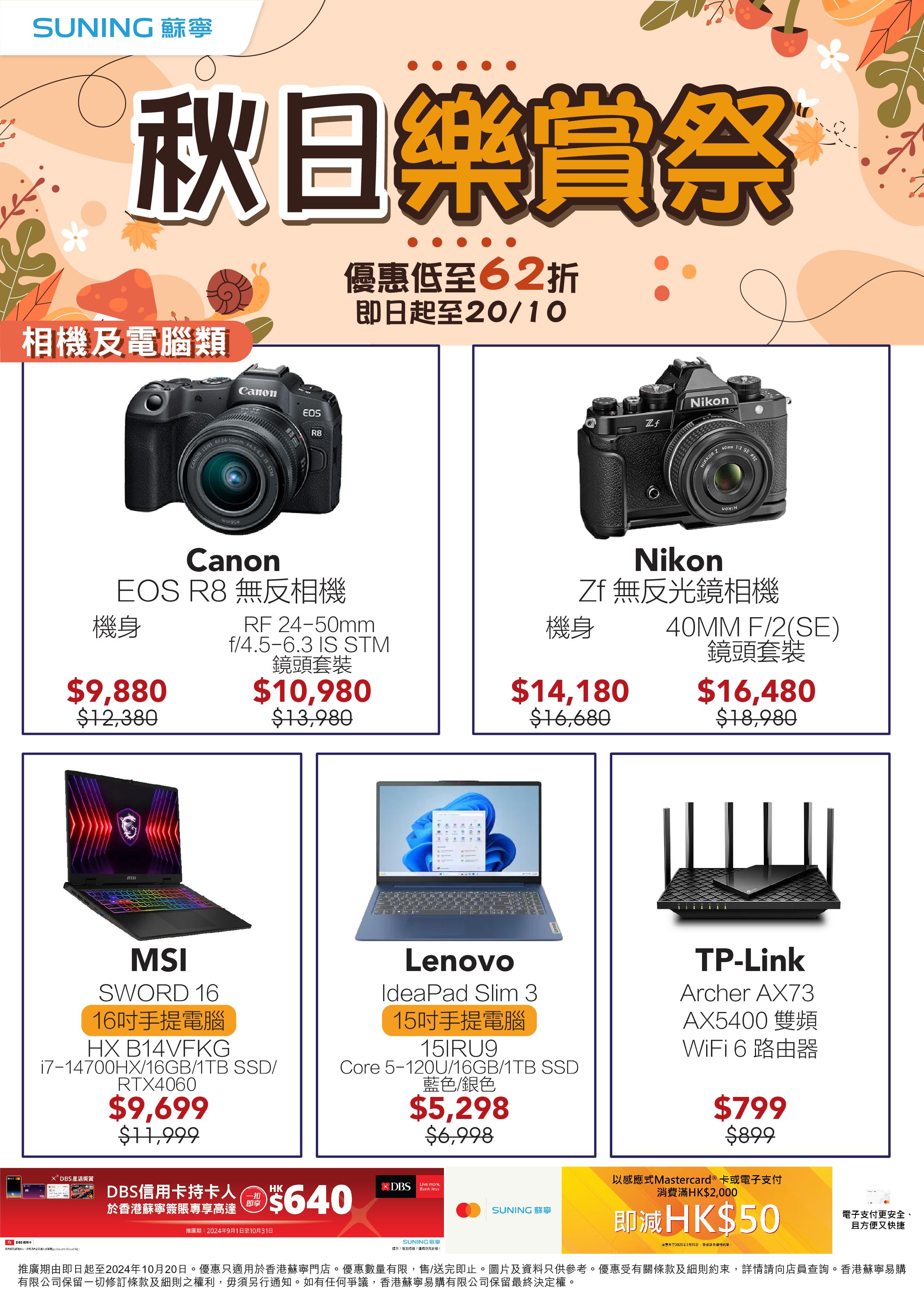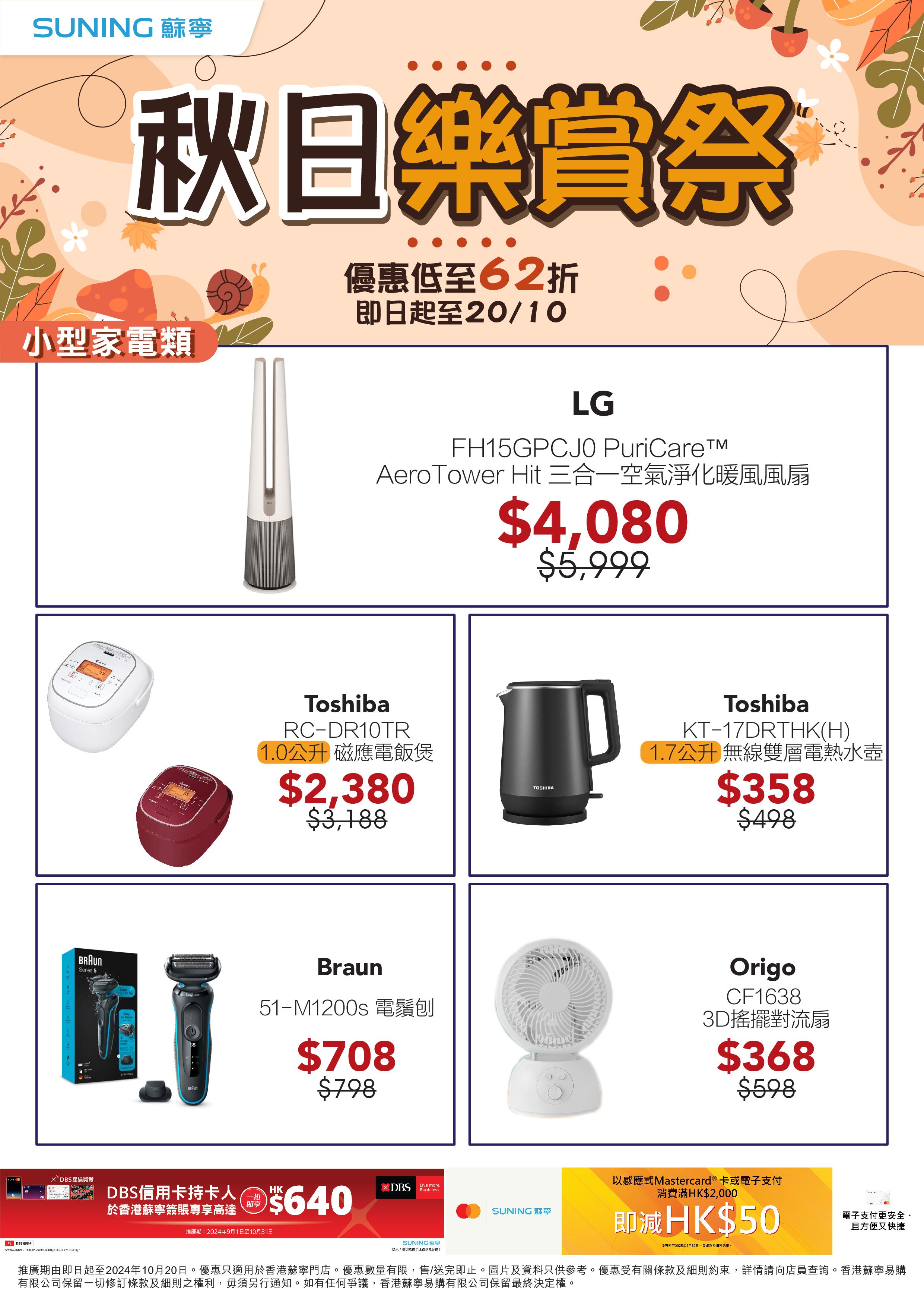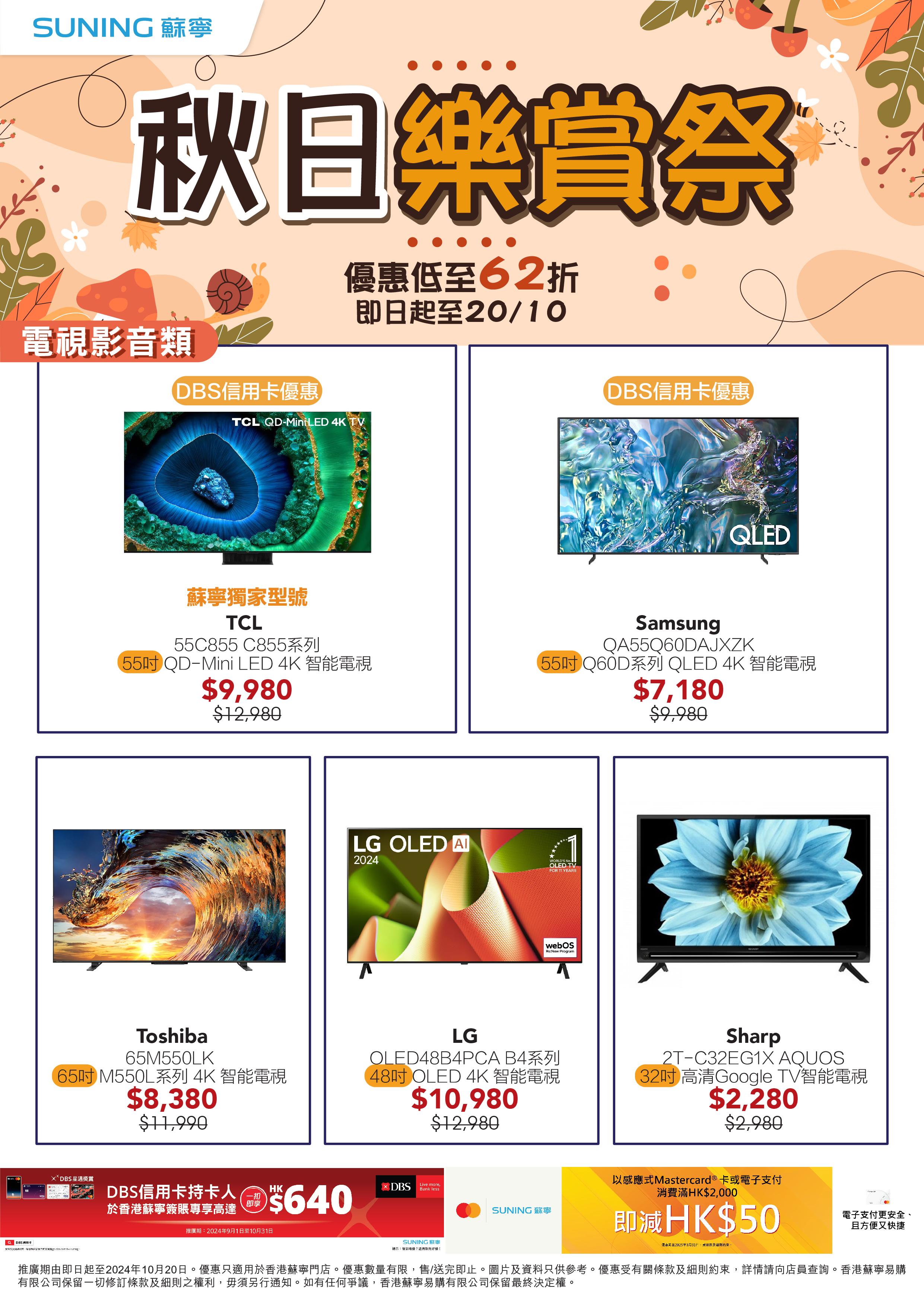 蘇寧秋日樂賞祭 全線門店優惠低至62折/網店55折起電器優惠/指定信用卡優惠
