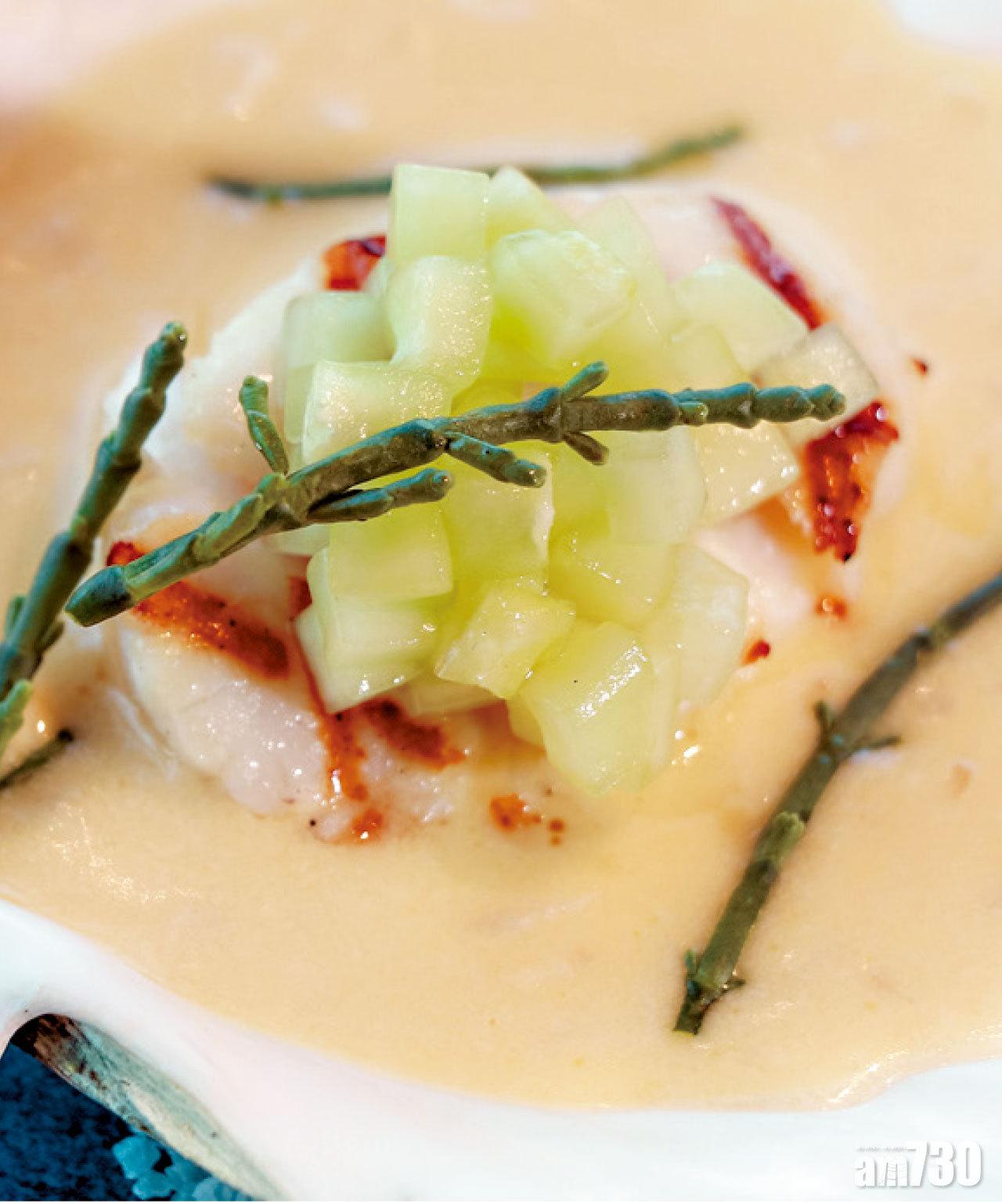 香港限定菜式Seared Hokkaido Hand-dived scallop,北海道手摘帶子塗上煙燻味噌牛油香煎,佐以青瓜及白醬油,非常清新。$180