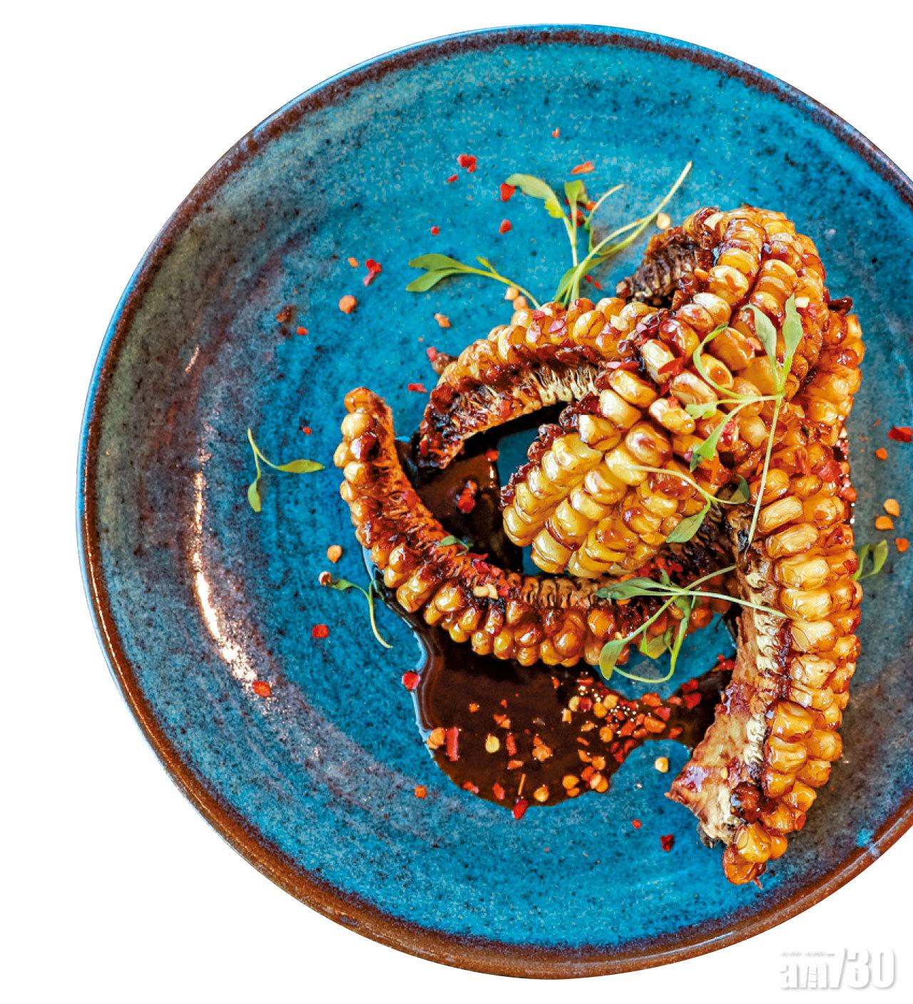 倫敦招牌菜Corn Ribs,大廚特意將粟米烤成捲曲狀,可以雙手捧著大快朵頤,香料有黑蒜燒烤醬及發酵辣椒,香辣又惹味。