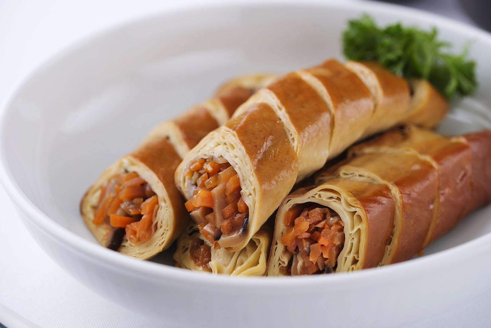 京式素鵝(細$98/中$148/大$198)─北京老家滋味「京式素鵝」,以豆香出眾的腐皮包裹口感各異的甘筍絲、冬菇絲及西芹絲,再採取茶熏處理,為素鵝注入獨特熏香,輕易吃到碟式朝天。