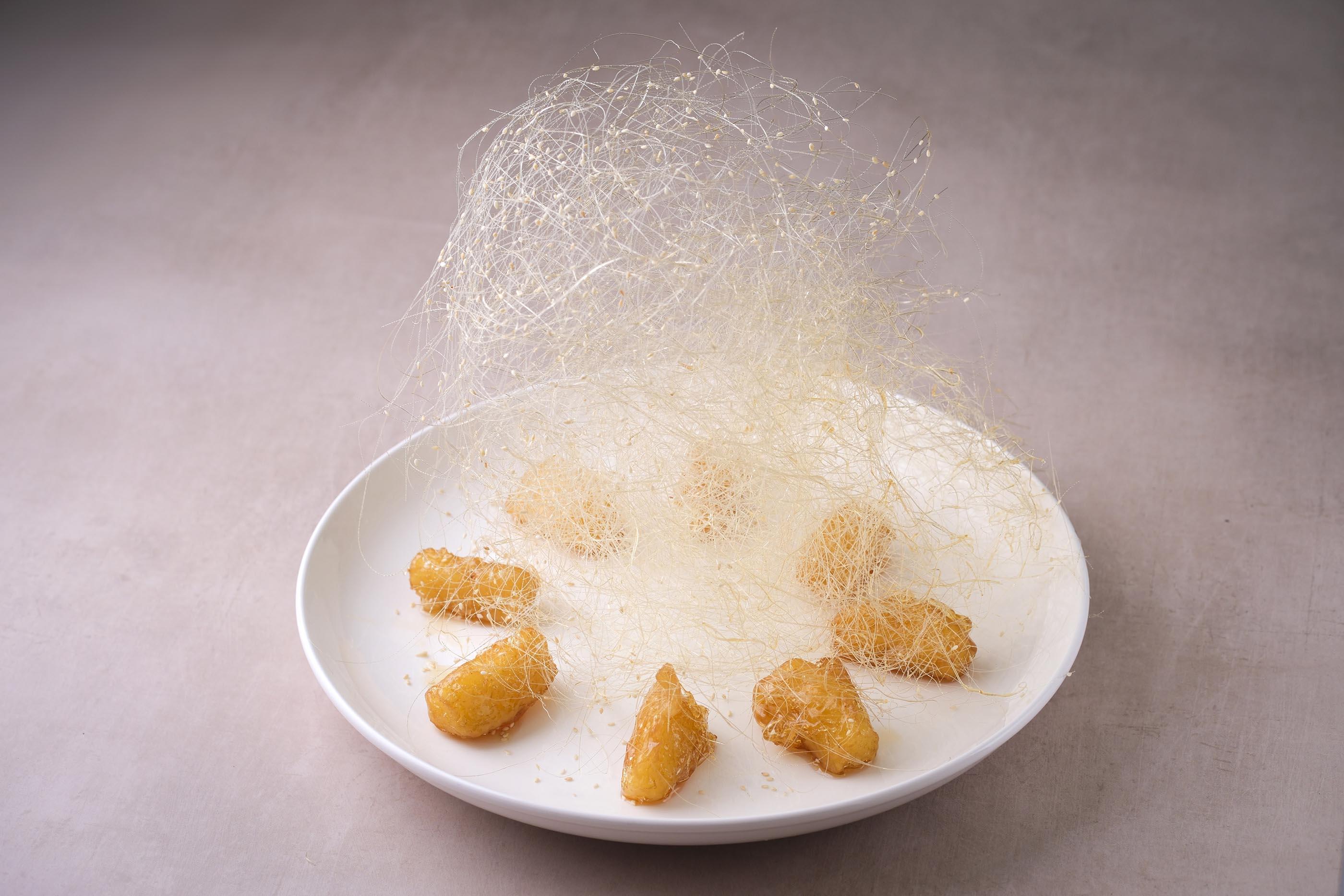 拔絲蘋果(細$72/中$122/大$172)─日月樓招牌打卡甜食「拔絲蘋果」,講究拉絲技藝,以巧手精製的糖絲網覆蓋日本富士蘋果,帶來甜脆的口覺享受。甜食還有高力豆沙香蕉(細$72/中$122/大$172)─豆沙蓉及香蕉披上如絲絹般綿滑的炸蛋白雪衣,即叫即炸的熱燙風味絕對教人一試難忘。