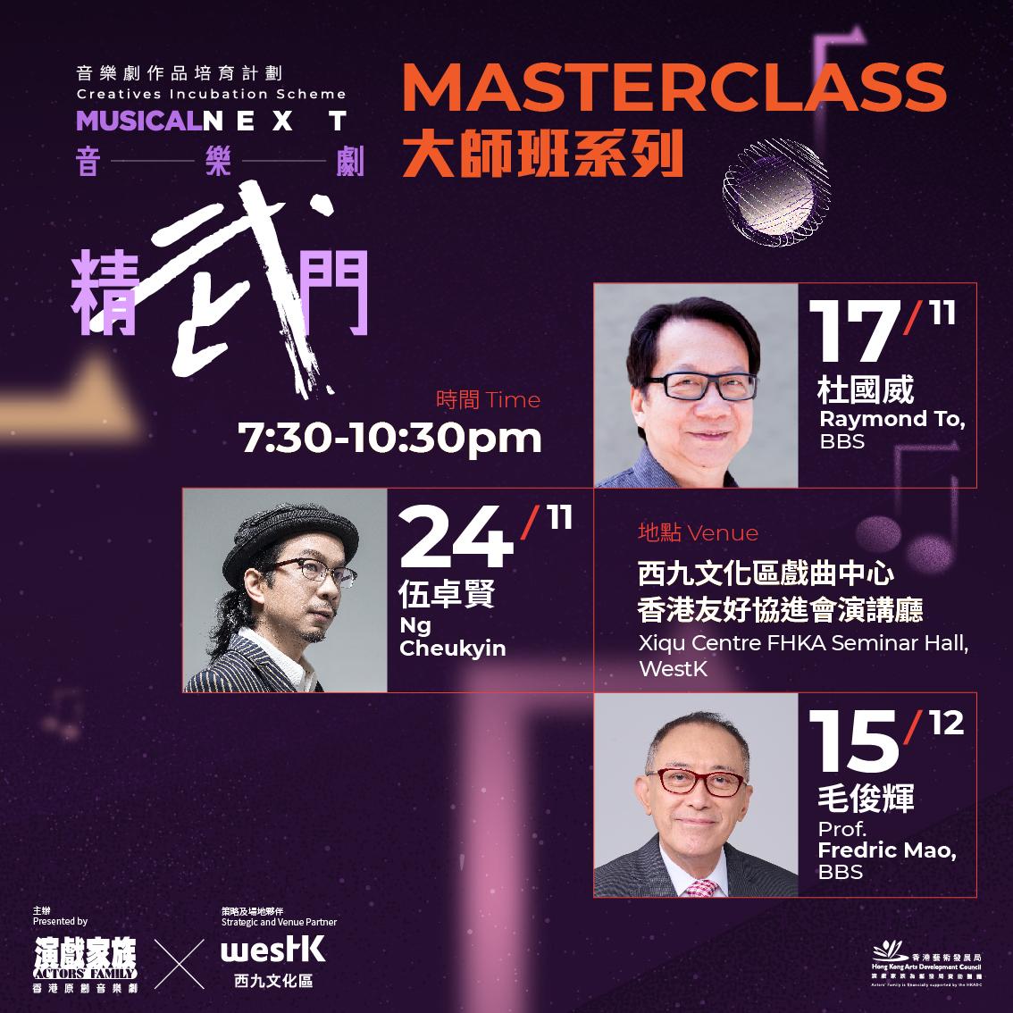 劇團演戲家族,與西九文化區合辦的「音樂劇精武門」,請來3位文化戲劇界泰斗,包括編劇的杜國威、作曲的伍卓賢,以及導演的毛俊輝,開辦3場大師班講座,跟業內人士及公眾,分享音樂劇的創作心得,以及美學藝術鑑賞的角度。