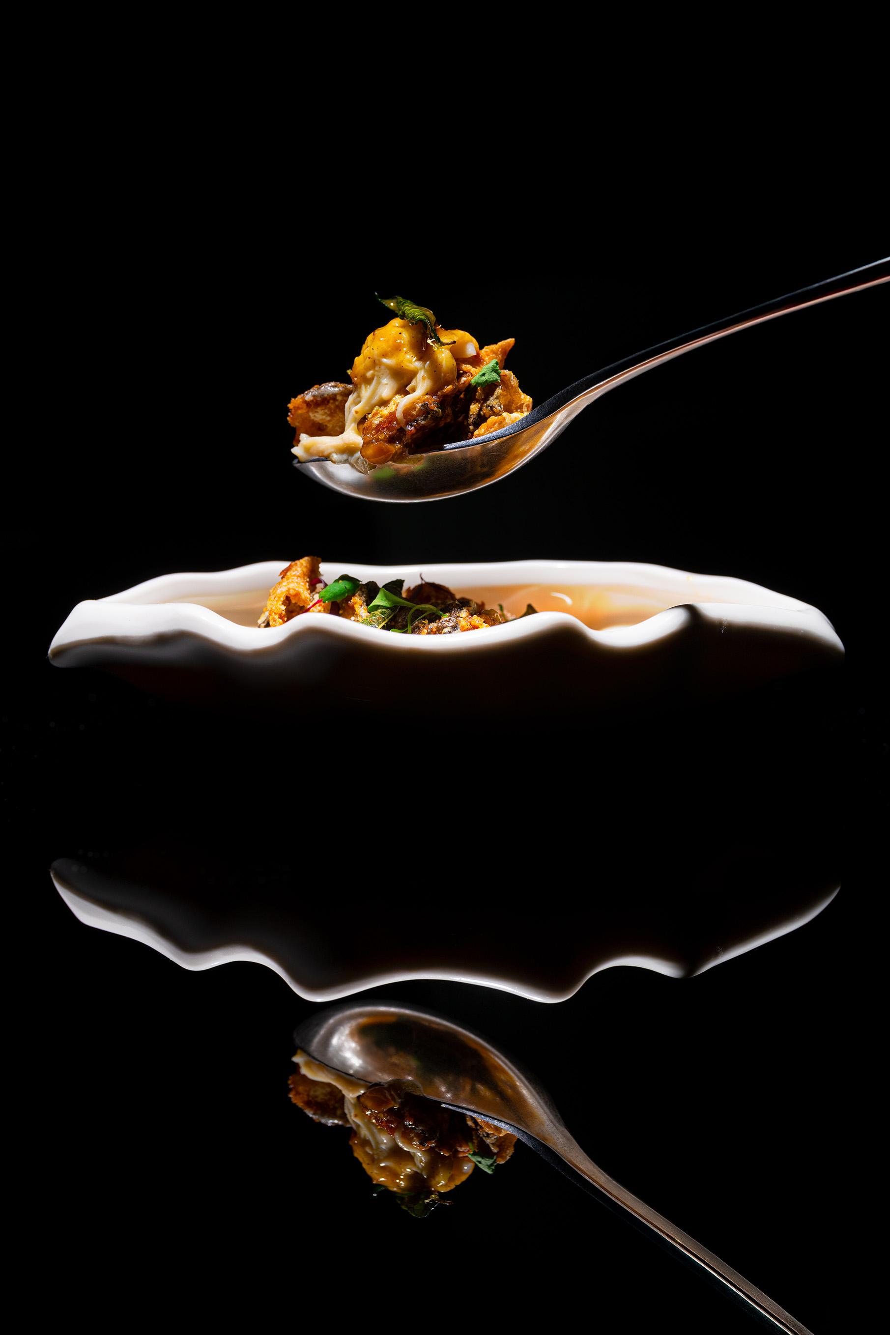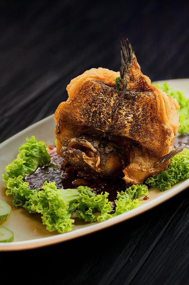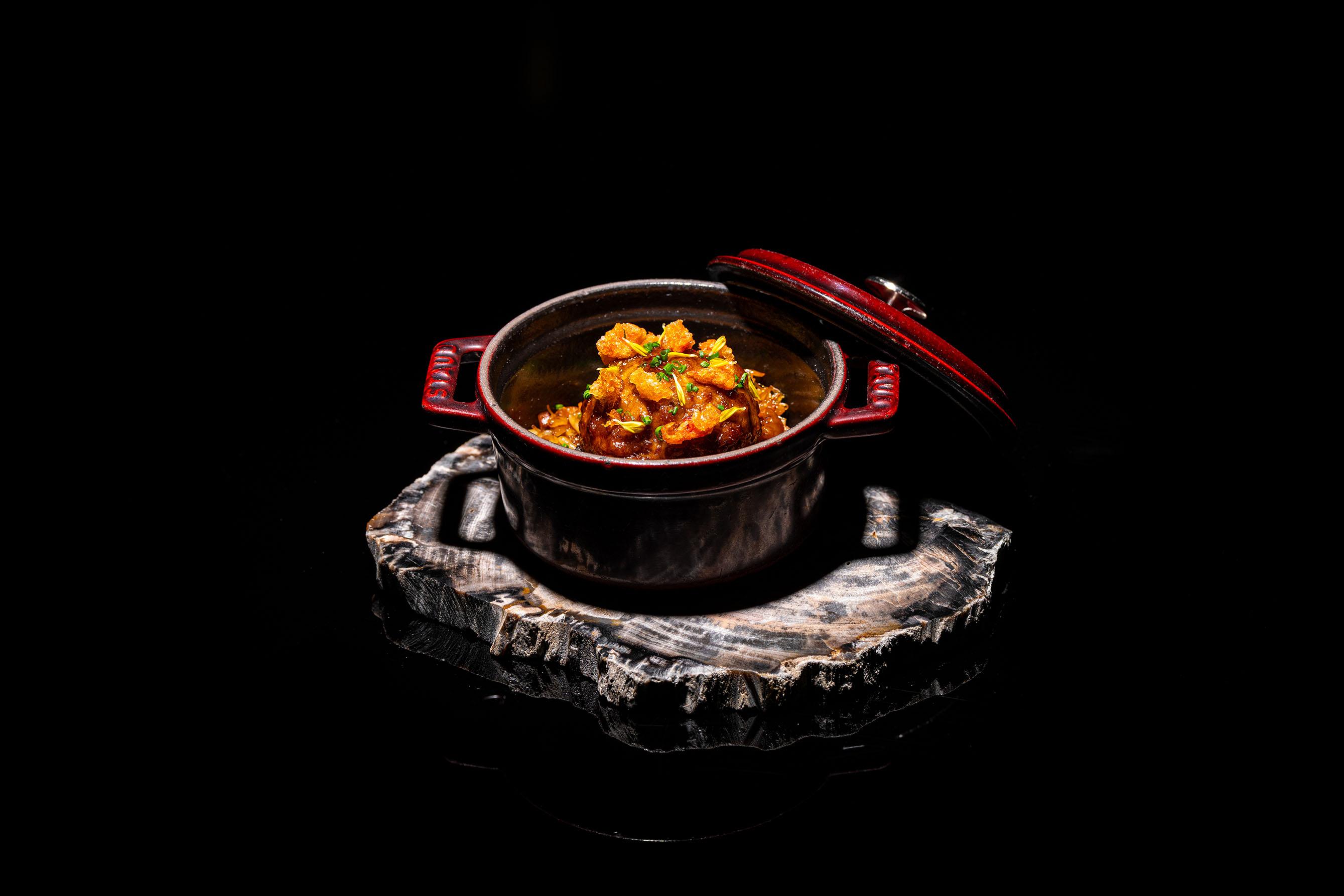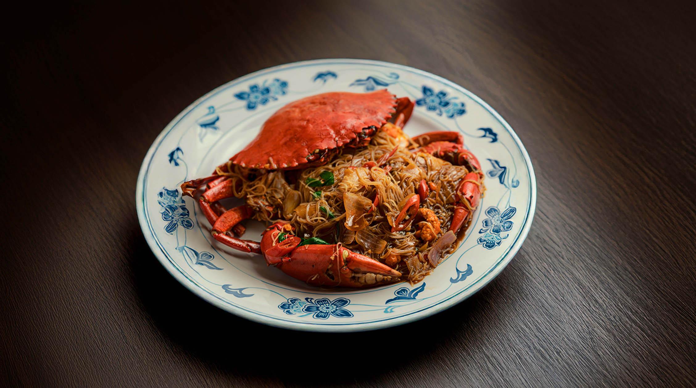 •焗澳洲青蟹、馬達加斯加白胡椒粒、鹹蛋、脆魚皮─煮至入味的澳洲青蟹,拌入白酒奶油醬、檸檬汁與白胡椒醬汁即成,並加入鹹蛋黃與炸魚皮進行翻炒提升口感。