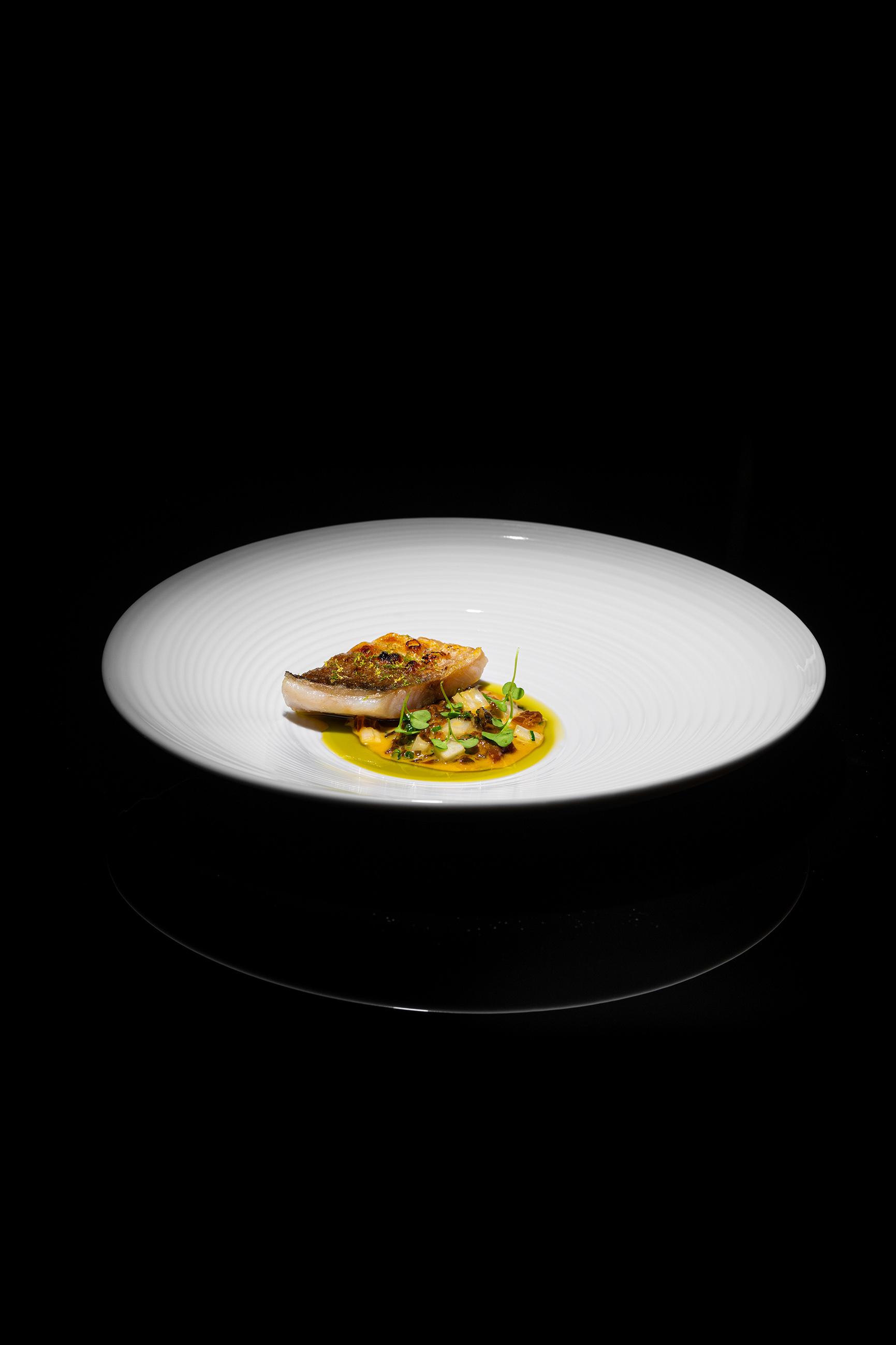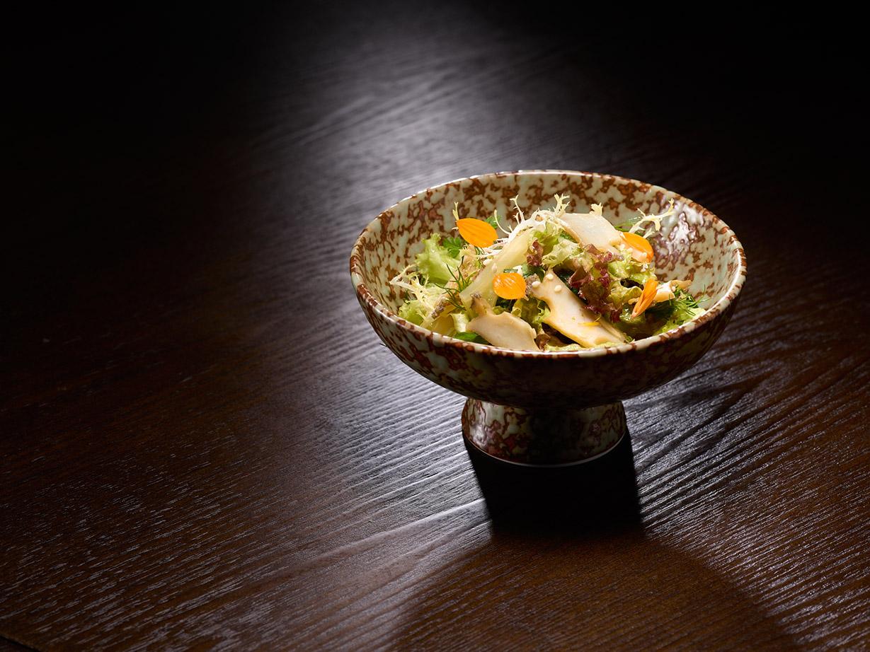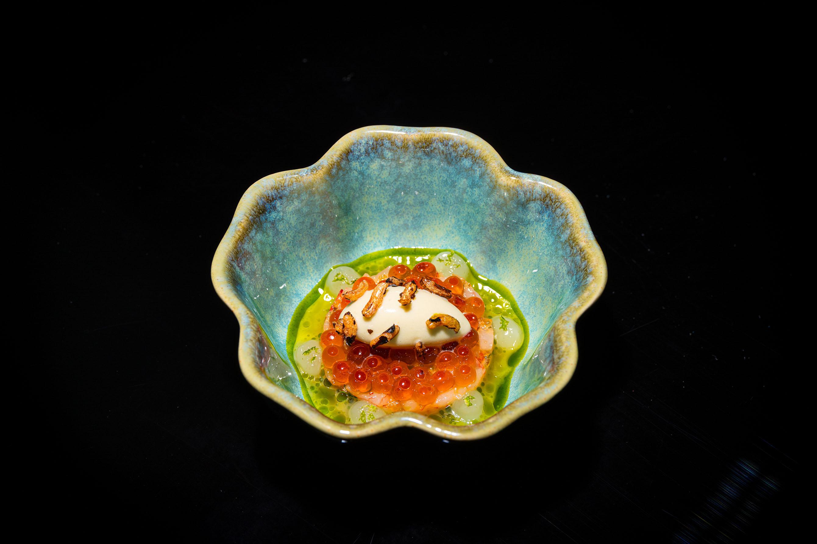 •西西里紅蝦、四川風味雪葩、鮭魚籽、萵筍、野米─風味濃郁帶點辛辣的前菜,經醃製後的紅蝦他他,配以四川風味雪葩,靈感源自四川傳統名菜酸菜魚。