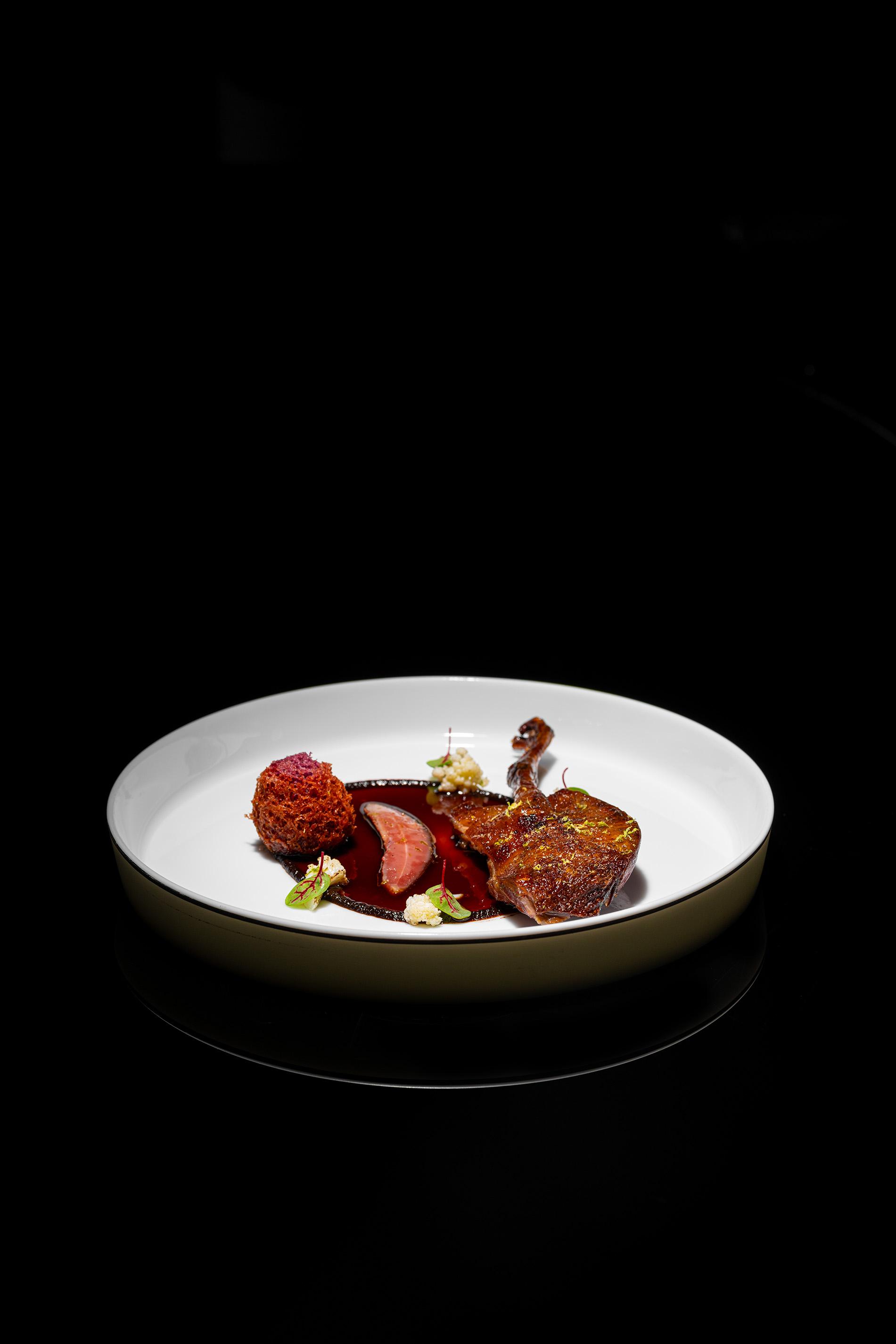 •五香豬柳、覆盆子醋、西班牙辣肉腸、糯米飯─豬柳以五香粉及馬蹄醃製,並搓成肉丸下鍋香煎,最後塗上肉汁、覆盆子醋及冷牛油烹煮成的醬汁。