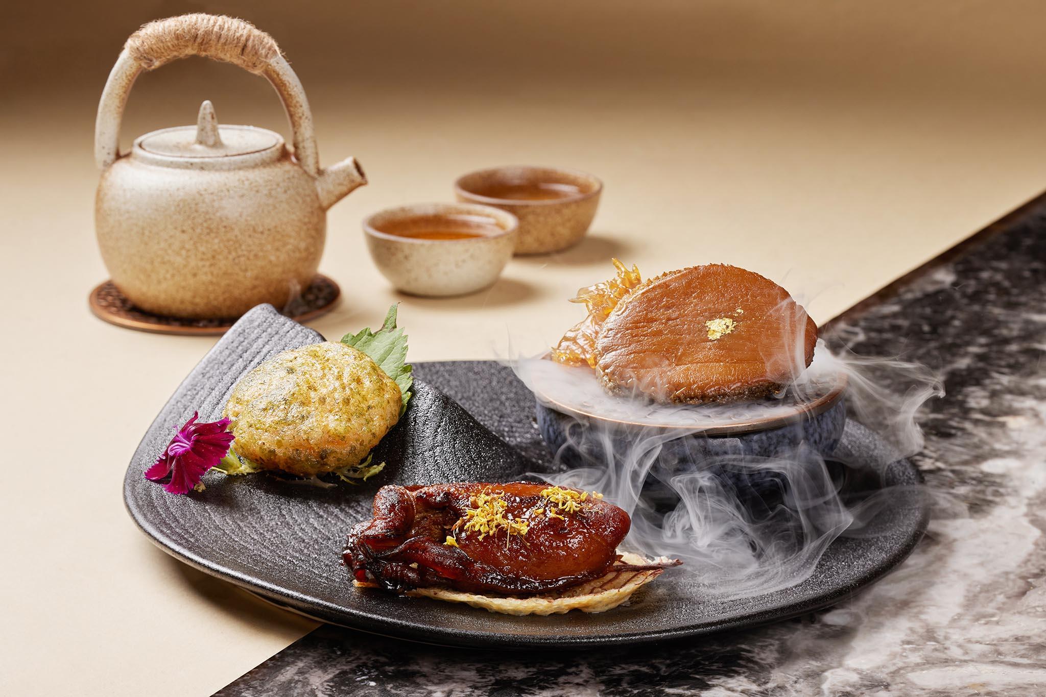 鮮味饗宴一共有六道菜,整個菜單一氣呵成。先以一道精緻的前菜三重奏開場,包括花雕醉鮑魚、海苔蟹粉脆藕餅和桂花蜜汁香煎金蠔,口感豐富多樣,以花雕醉鮑魚最為突出,一啖入魂,而金蠔Size巨大,煎得甘香肥美。松茸螺頭瑤柱燉花膠,這道湯品融合了松茸的清香、螺頭的鮮美、瑤柱的鹹香和花膠的膠質,營養價值極高,花膠頭數亦絕不欺場,足見「如」的食材不惜工本。海鮮汁脆皮釀日本遼參,黃師傅的招牌菜之一,將日本遼參填滿豬肉蝦仁餡料,再以脆皮手法烹製,最後淋上鮮美的海鮮汁,香脆又爽口,層次豐富分明。魚香茄子燴美國龍蝦非常創新,巧妙地將傳統地道的魚香茄子與美國龍蝦相結合,展現全新風味。梅菜帶子脆紅米飯。以鮮甜帶子和鹹香梅菜,再加入脆米提升口感,將炒飯昇華到精緻的層次。最後以一道創意甜品組合作結:黑糖桃膠薑汁奶凍配紫薯蜂巢香芒酥,既有傳統甜品的影子,又融入了時尚的創新元素,甜而不膩。