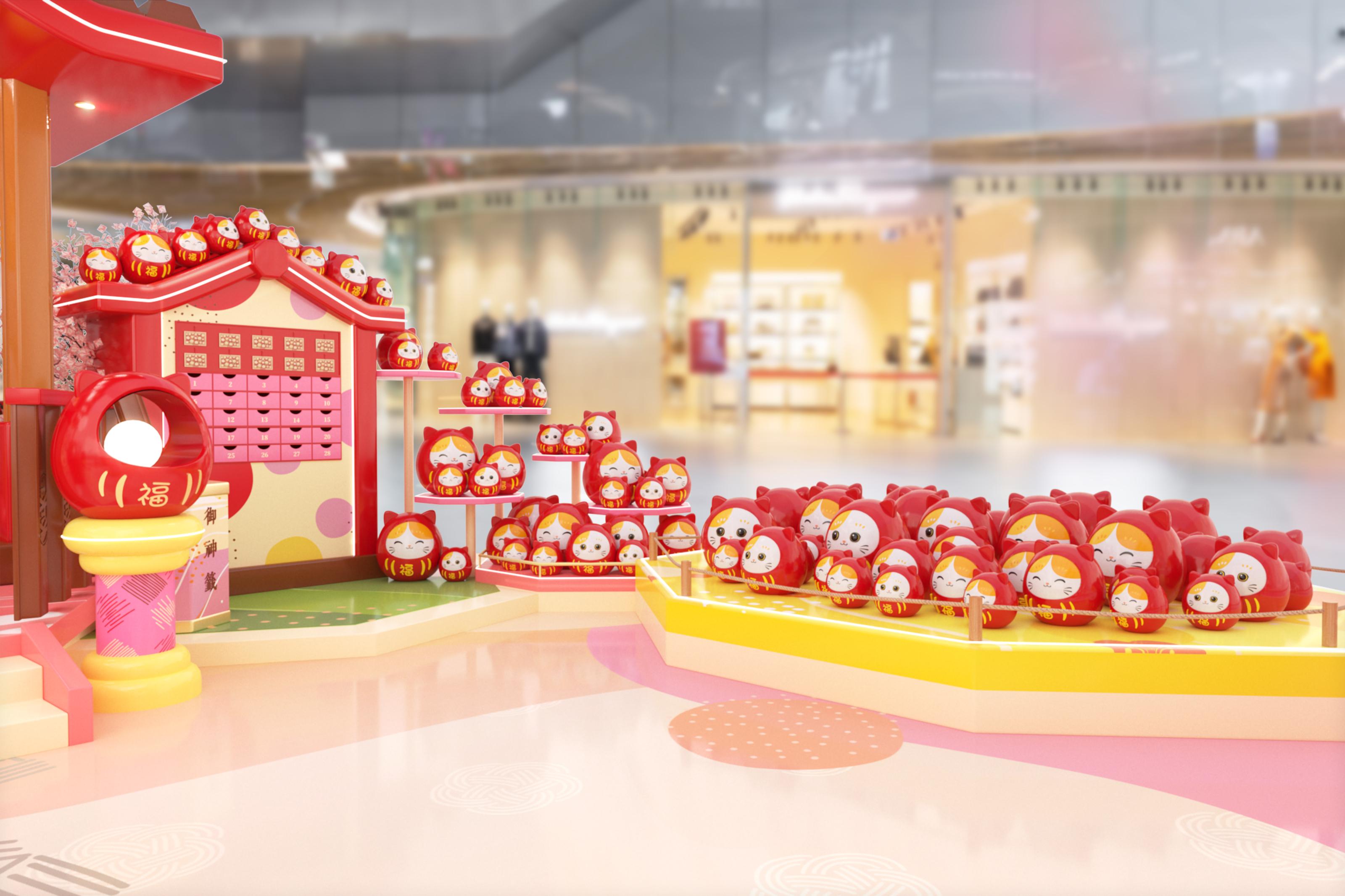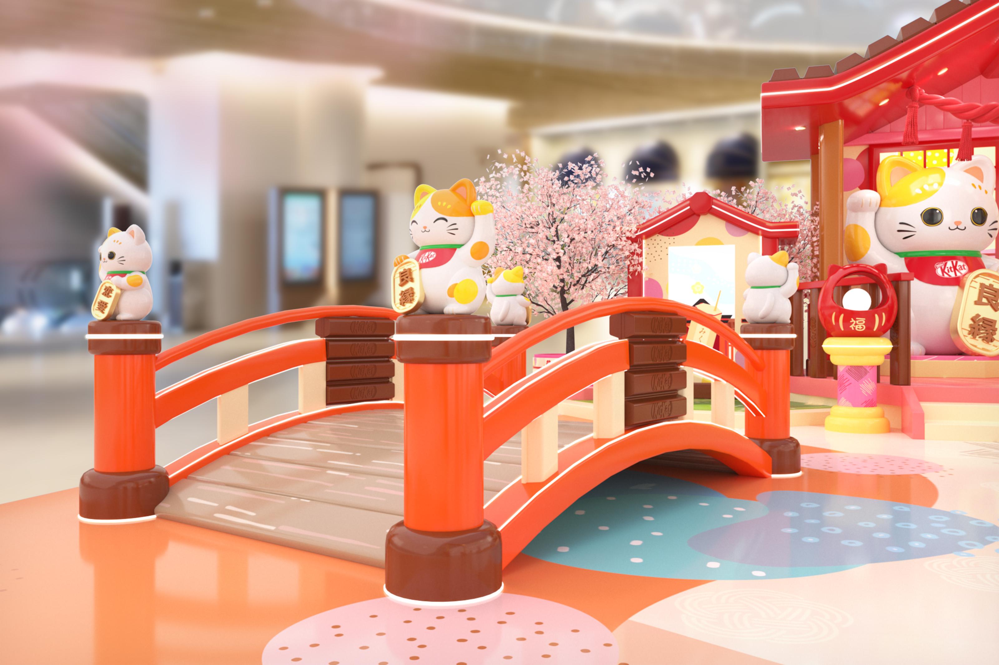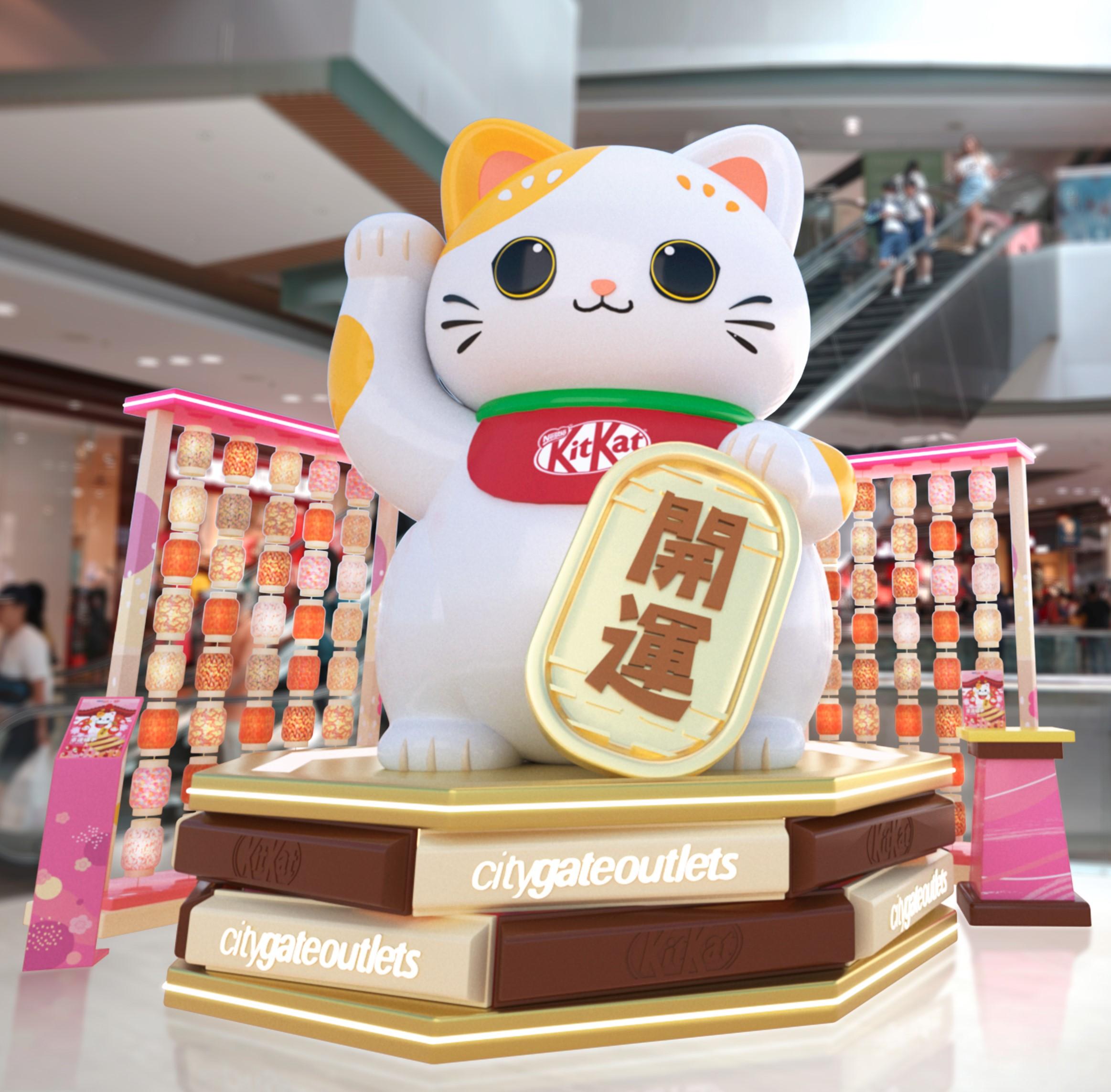 東薈城名店倉與KITKAT共同打造8大祈福裝置,最受矚目當然是坐落於中心位置的4米高「開運招財貓」。招財貓以KITKAT®朱古力威化設計,左手抱著「開運」金幣,而右手不停的擺動,象徵財源滾滾來。招財貓背後的花燈屏風由128個全人手日式燈籠組成。為了響應太古地產「2030 可持續發展策略」,商場特意邀請燈籠紮作師Mo Cheng與東涌嗇色園主辦可譽中學暨可譽小學的同學共同製作,別具意義。