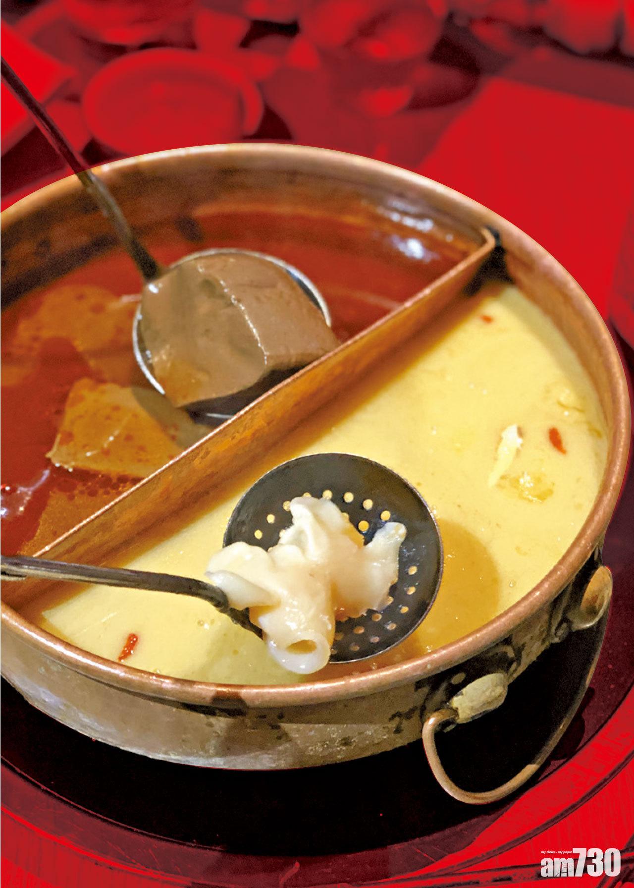 湯頭絕無肉類,以麻為主,辣度適中,「只麻你口,不嗆你喉」,可以喝下去的麻辣火鍋湯;湯內鴨血,由台灣直送,絲滑程度猶如果凍,切開後並無氣孔,非常高質。