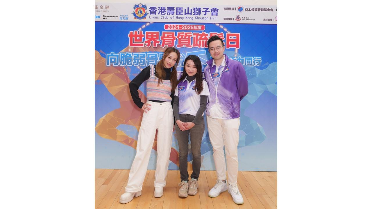 香港壽臣山獅子會長蘇慶倫(右一)及[世界骨質疏鬆日]大型骨質檢測活動大會主席危月瑩(中)及活動大使曹敏寶(左)一起為活動落力推廣。