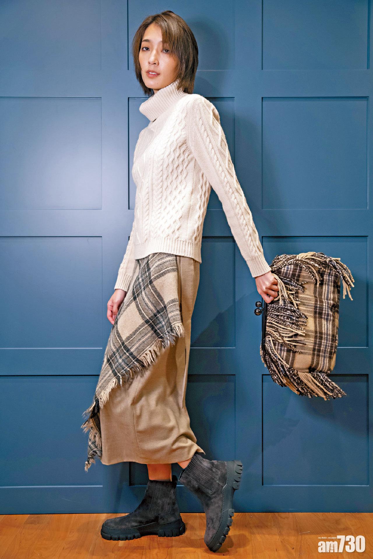 杏色knit top $3,580 啡黑色格紋skirt $4,480、 啡黑色格紋hand bag $4,380、 黑色麖皮boots $3,080