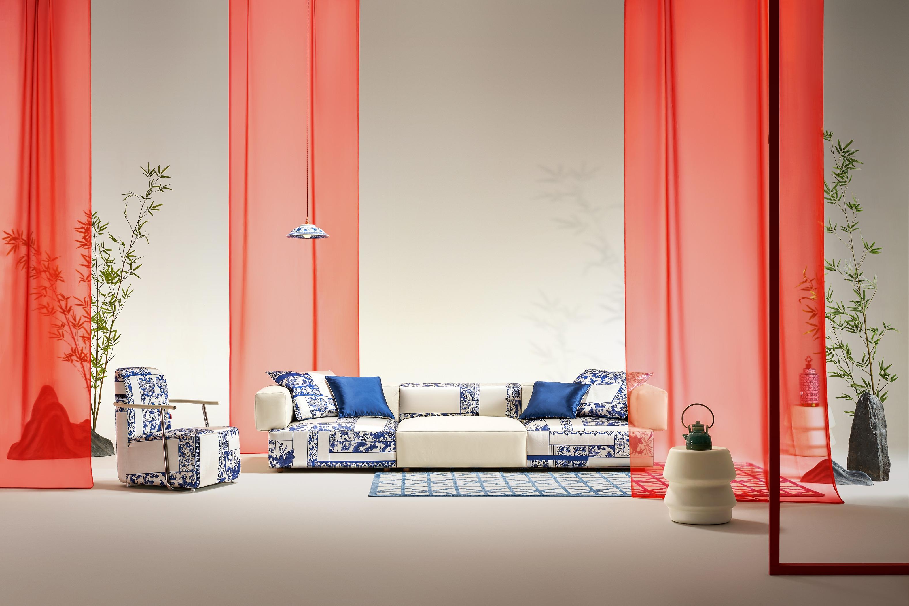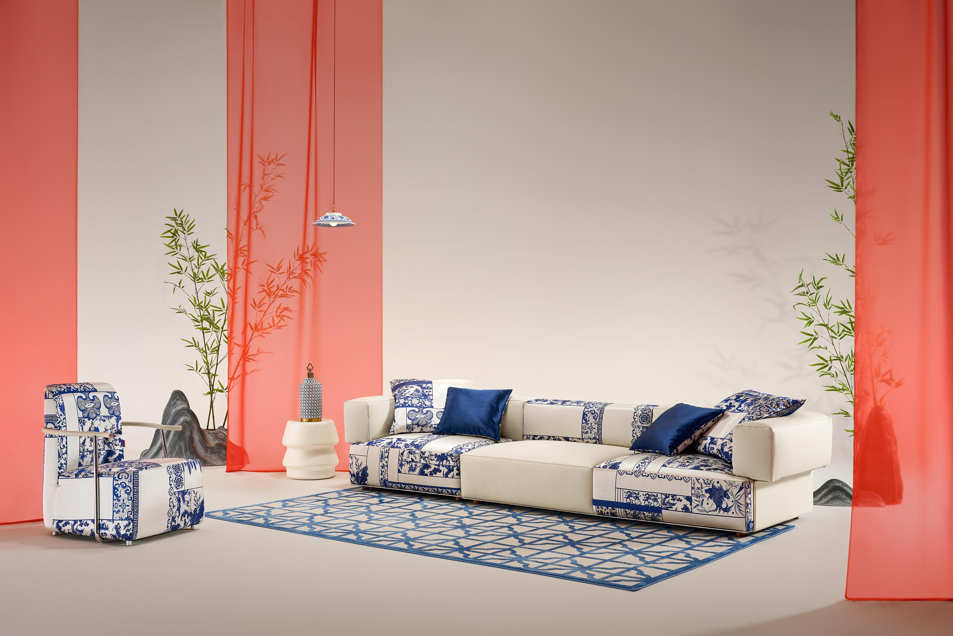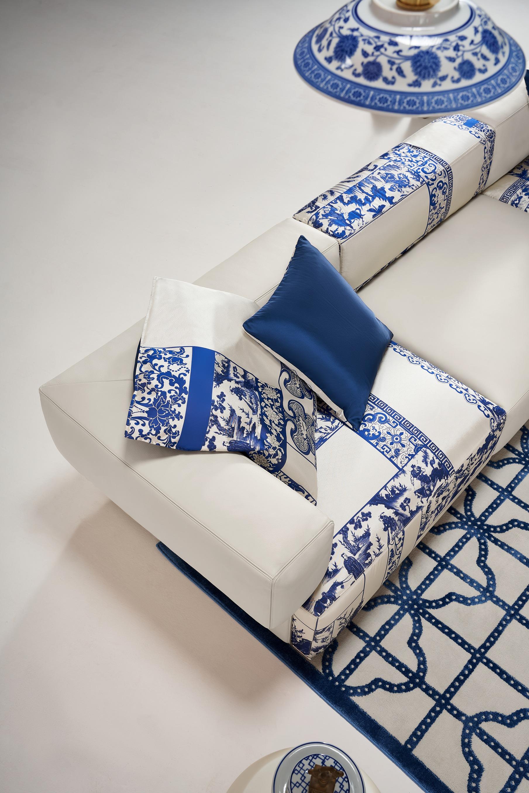 KUKA HOME國禮青花系列將傳統青花瓷元素融入現代家具設計,運用非物質文化遺產的織錦工藝,青花紋樣栩栩如生,讓青花梳化不僅是一件實用的家具,更如藝術品般提升家居的藝術氛圍,結合東方傳統文化與現代設計,呈現文化內涵和藝術價值。