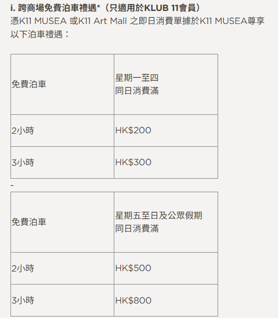 KLUB 11會員逢星期一至四於K11 MUSEAK11購物藝術館憑任何消費分別滿$200300,即日可於K11 MUSEA享用2小時及3小時免費泊車優惠。逢星期五至日及公眾假期於K11 MUSEAK11 購物藝術館同日消費分別滿$500$800,即日可於K11 MUSEA享用2小時及3小時免費泊車優惠。