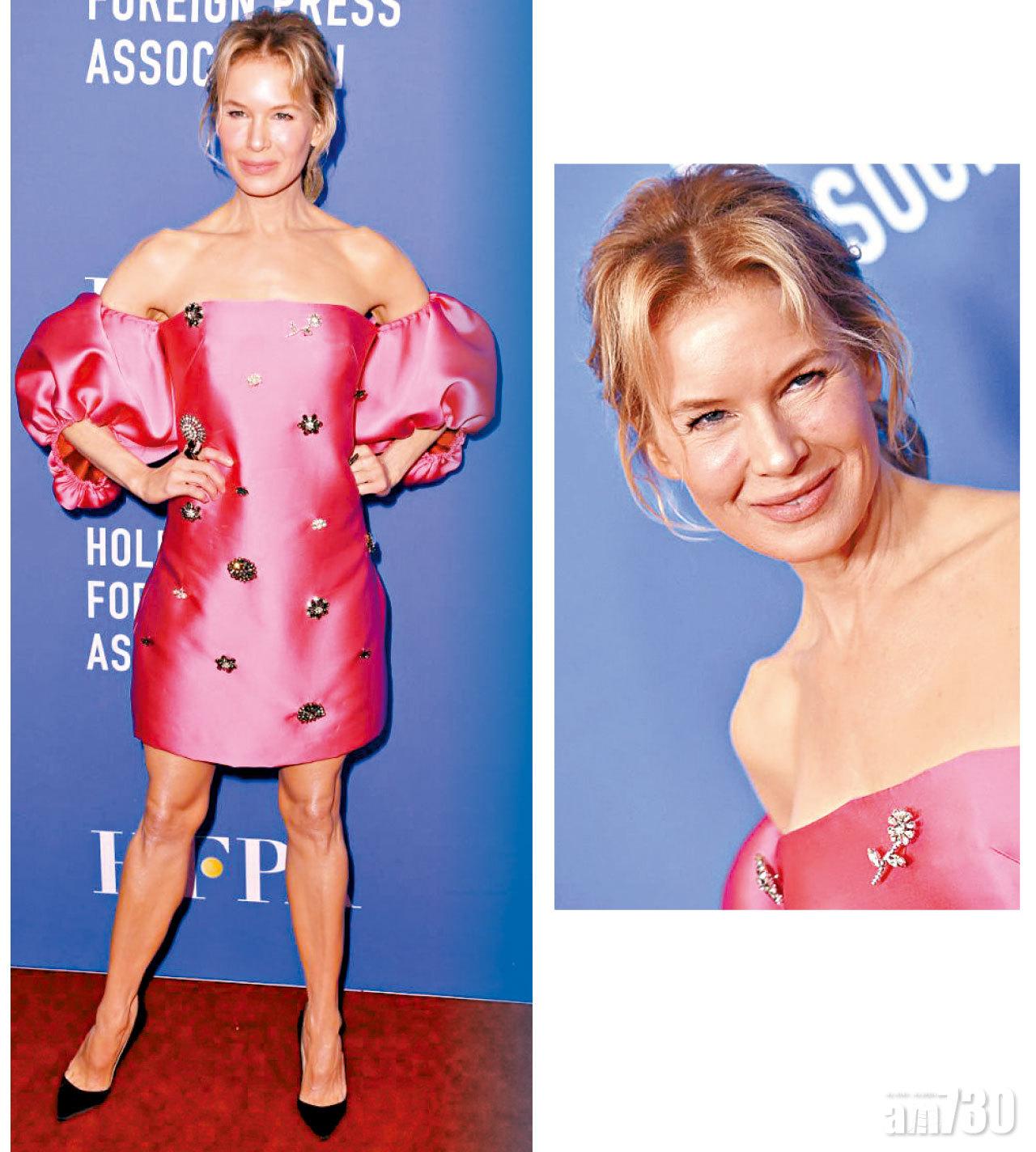減肥是女士畢生追求的事業,但太瘦易顯老,好像當年憑《BJ單身日記》甜美形象走紅的女主角雲妮絲惠嘉(Renee Zellweger),日前出席公開活動時,纖瘦身材加上年逾半百,就顯得又老又乾,比真實年齡老了一截。好在她揀選Lela Rose 2020早春系列露膊party dress,嬌柔的粉紅散發亮麗迷人姿態,挽回不少分數。(互聯網)