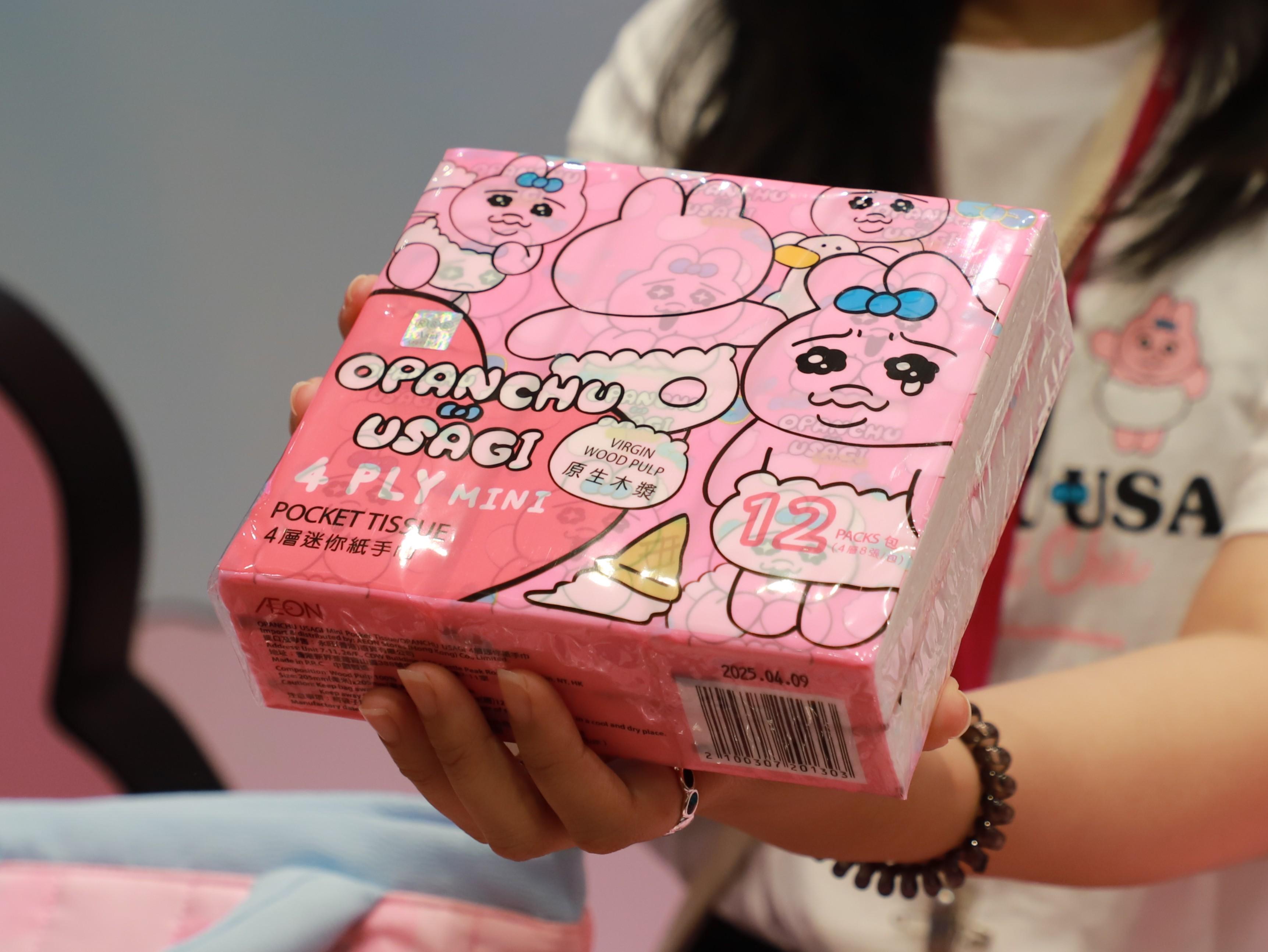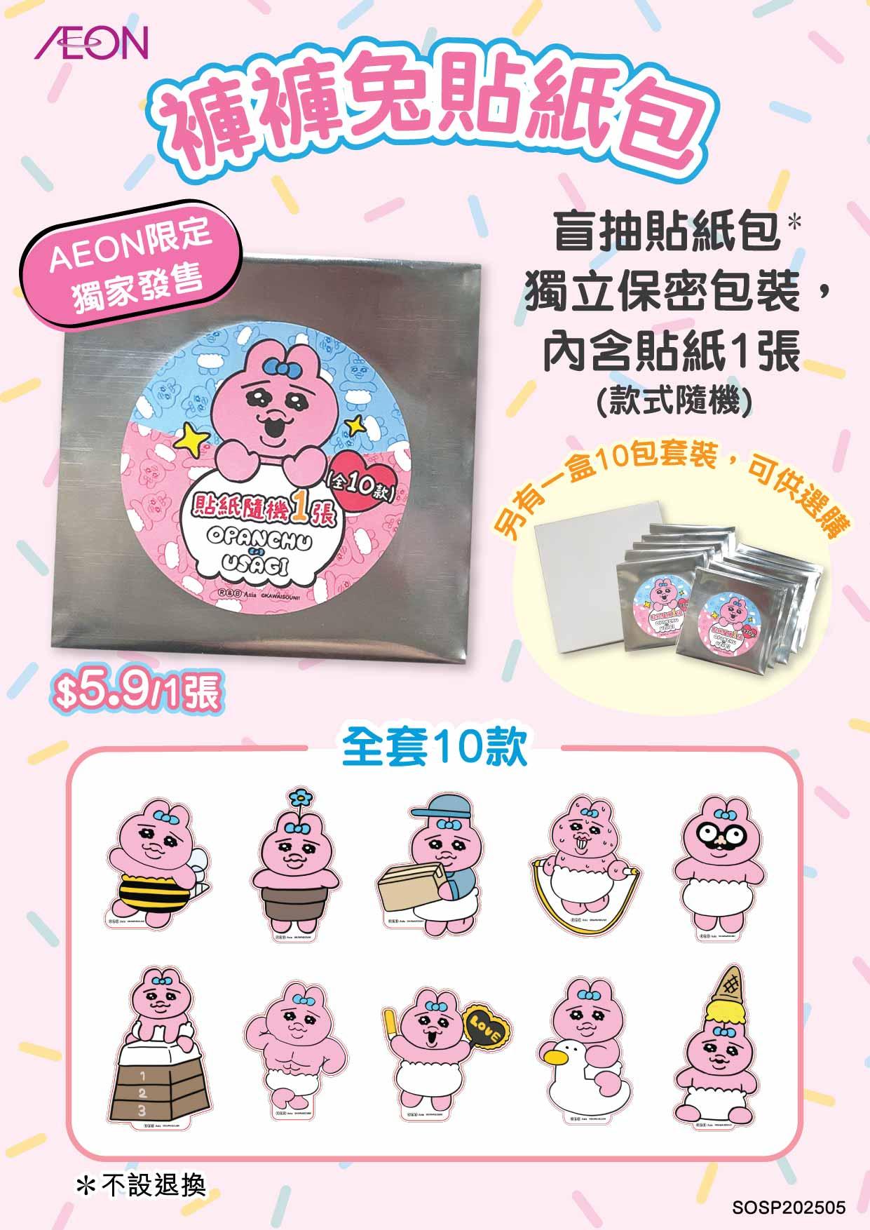 全線AEON、AEON STYLE、AEON SUPERMARKET店鋪、AEON Mobile 網購和AEON網上購物城,超過20款的「Opanchu Usagi褲褲兔」商品已正式推出,包括食品、家品、服飾、餐具、文具等一應俱全。