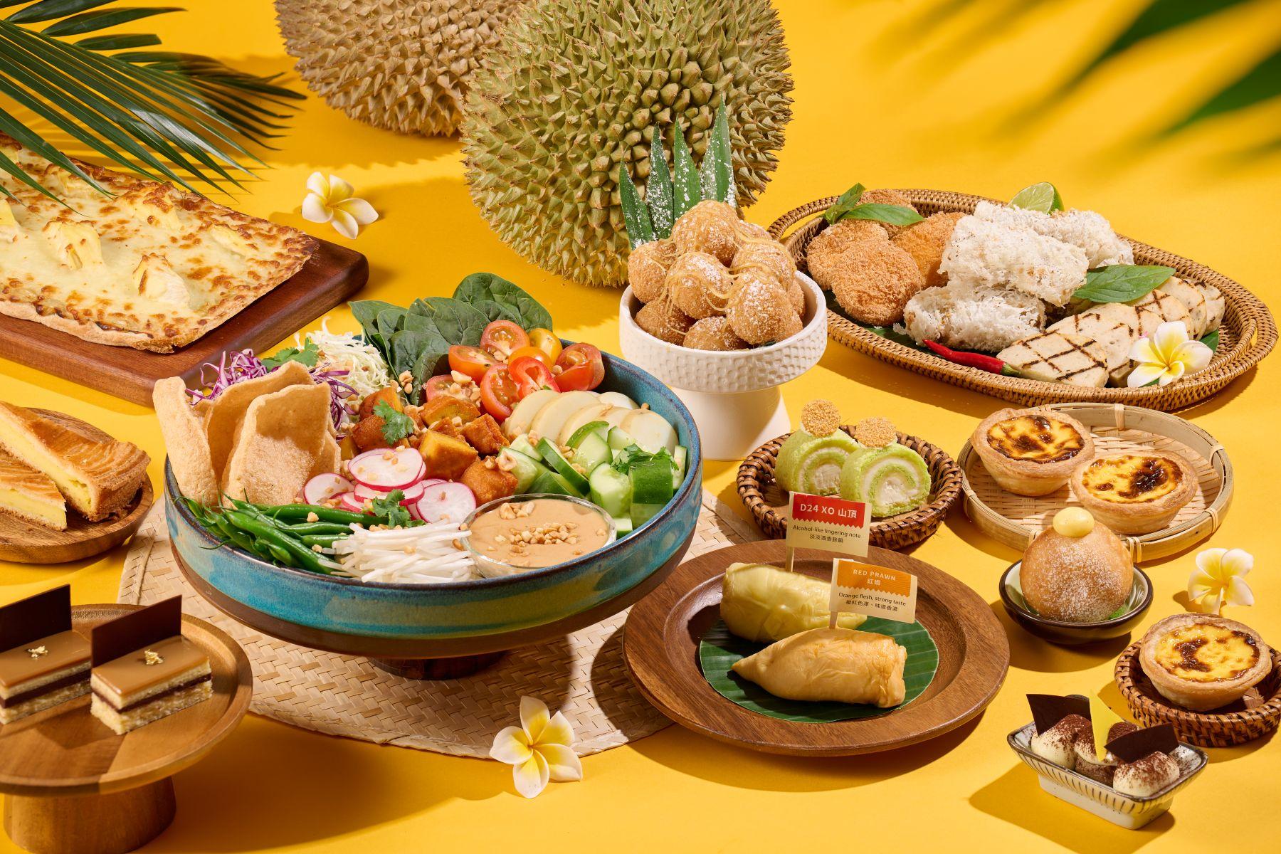 式榴槤椰奶芋圓、榴槤意式冰淇淋、榴槤提拉米蘇、法式牛奶朱古力榴槤布甸等;榴槤糯米糍、榴槤葡撻、榴槤冬甩、榴槤巴斯克芝士蛋糕等精彩甜點亦同步回歸。酒店行政總廚 Michael Clinton 帶領廚師團隊,將榴槤融入鹹點,炮製一系列創意之作,包括榴槤芝士蛋餅、榴槤咖央包、班蘭饅頭佐榴槤醬、榴槤薄餅、酥炸榴槤球等。每位成人享用下午茶更可獲贈精選榴槤兩件,精選品種如 D197 貓山皇、 D24 蘇丹王及 D101 紅肉。