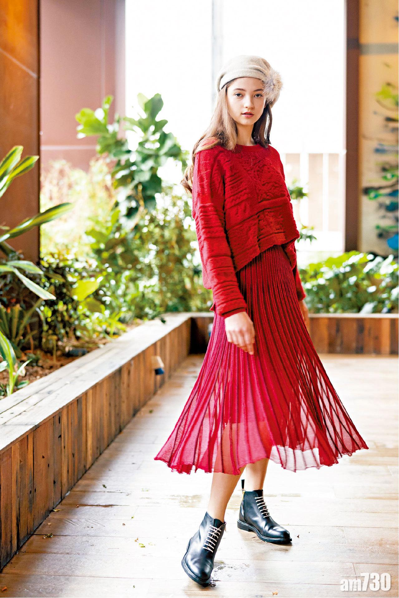 杏色balloon hat by CA4LA $995; 紅色knit top by BOUSSOLE $3,495; 紅色百褶薄紗skirt by BOUSSOLE $3,695; 黑色皮革booties by ATP ATELIER $4,994