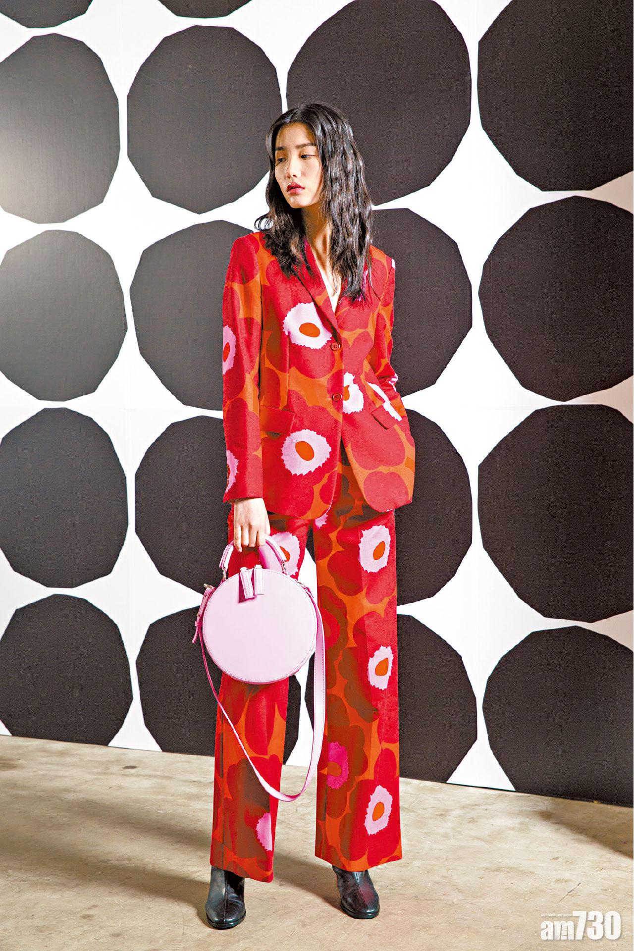 紅橙色floral print blazer $3,695; 紅橙色floral print trousers $2,195; 粉紅色圓形皮革hand bag $3,695; 黑色紅踭ankle boots $3,995