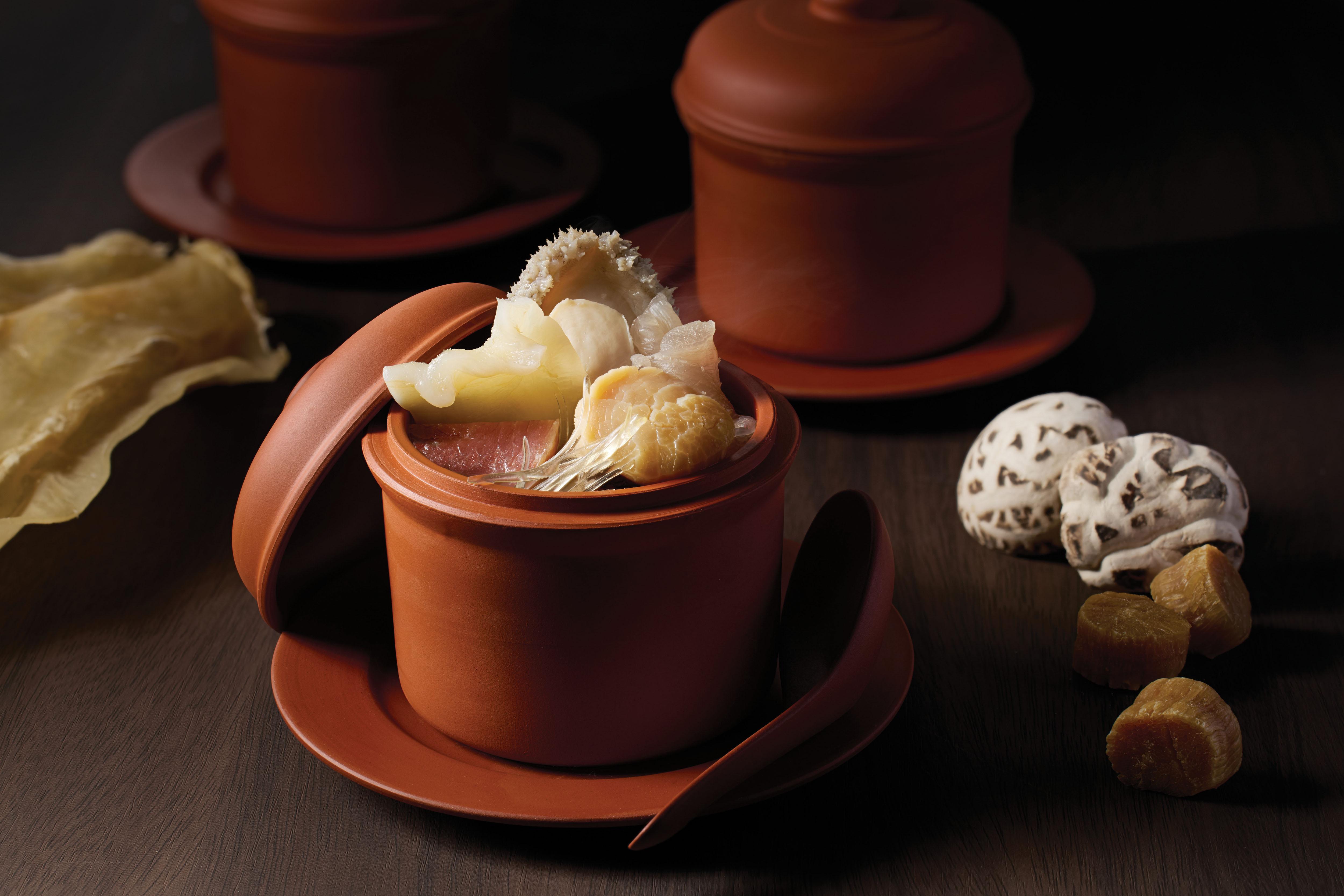 名貴中式海味珍饈一直是JW 咖啡室的招牌,全新菜單帶來古法燜南非鮑魚滑雞,用老雞、瘦肉、金華火腿和乾瑤柱熬出濃郁上湯,鮑魚軟嫩彈牙,雞肉鮮香滑溜,入口即化。野米濃湯燴花膠火腿選用高纖野米,帶淡淡木質芳香,配上澳洲花膠的厚實膠質,滋補養顏,暖心又暖胃!