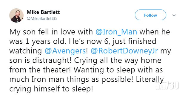 一位只得6歲的Iron Man小fans,最近睇完《A4》,散場後由戲院返屋企的路程中一直爆喊,回到家中立即跳上床,將所有Iron Man玩具圍住自己,又攬實Iron Man毛公仔,繼續喪喊。小fans的爸爸透過Twitter分享事件,話囝囝不斷喊住大叫「我想Iron Man返嚟!我想再見到Iron Man!」