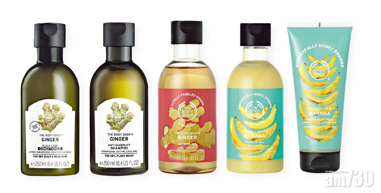 生薑頭皮護理護髮素($69/250ml; $99/400ml)、洗髮露($29/60ml; $69/250ml; $99/400ml)、生薑沐浴露($59/250ml)、香蕉沐浴露($69/250ml)、香蕉身體磨砂($109/200ml)