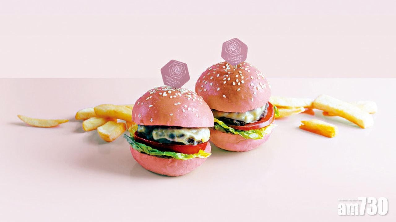 「玫瑰仲夏堡堡」,坊間絕少見到的粉紅漢堡包,選用100%澳洲優質牛肉漢堡扒入饌,加上白車打芝士及紅菜頭汁製成的夢幻粉色漢堡包,散發著濃厚童話式的浪漫情調。$148(2件漢堡配薯條)