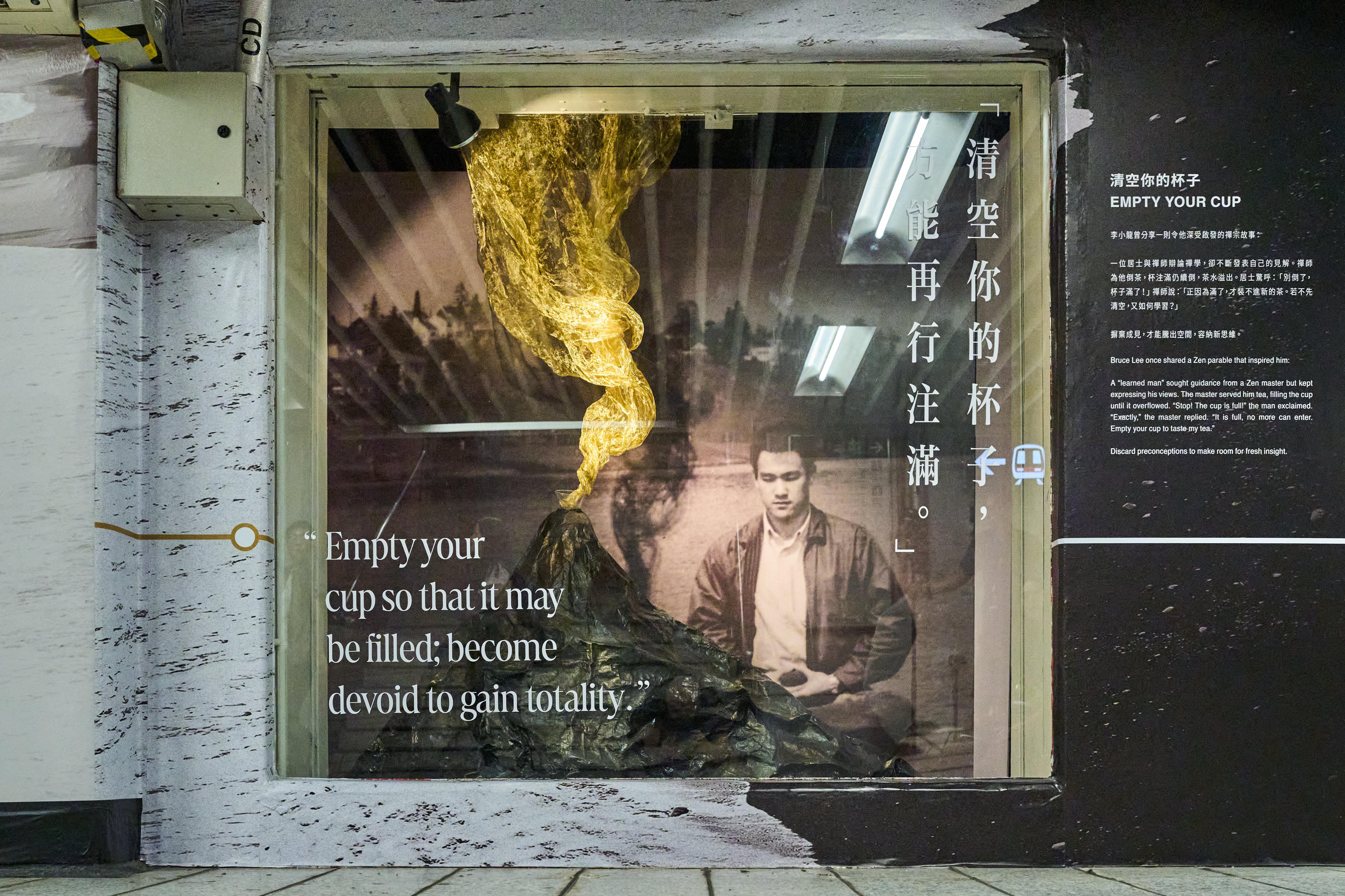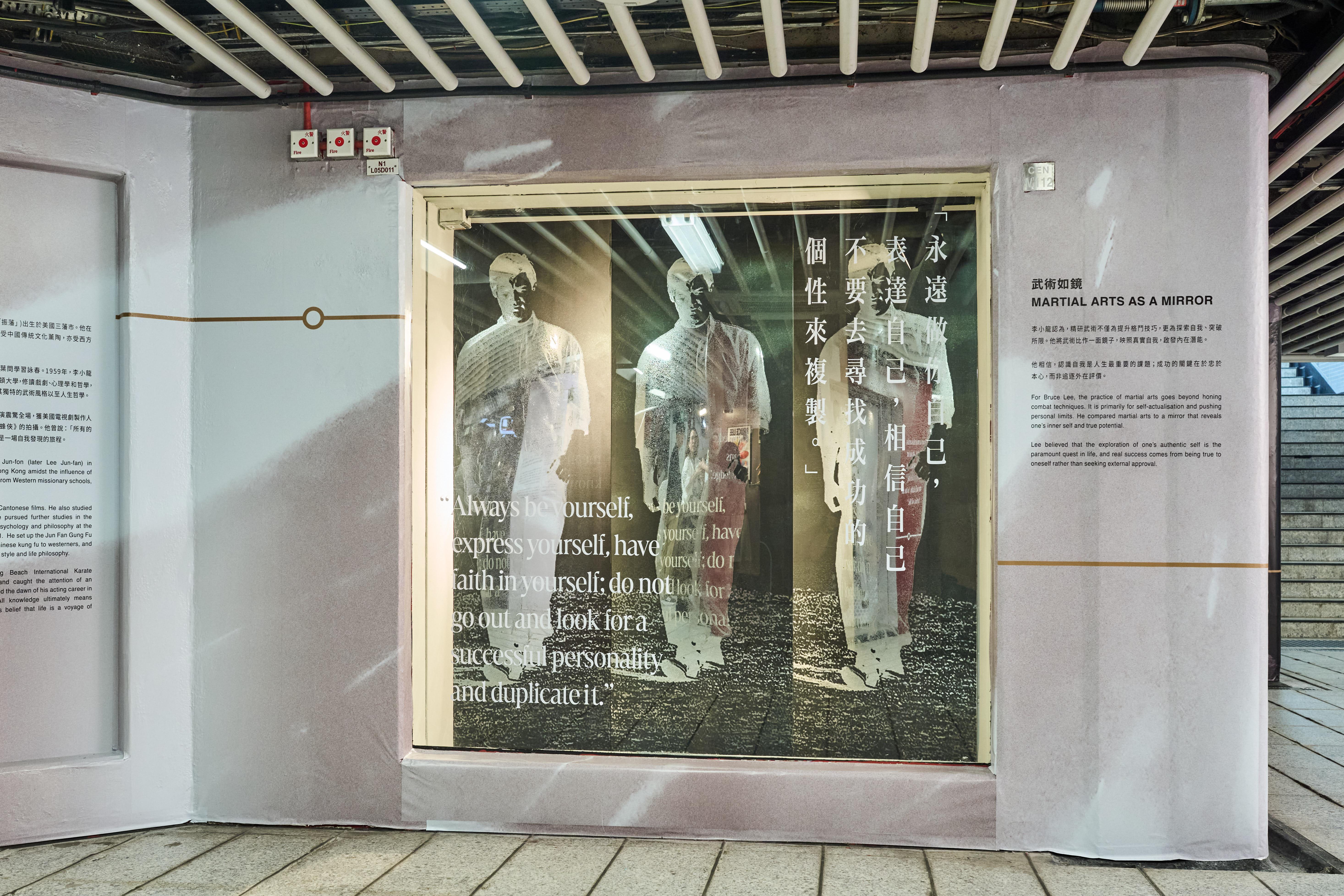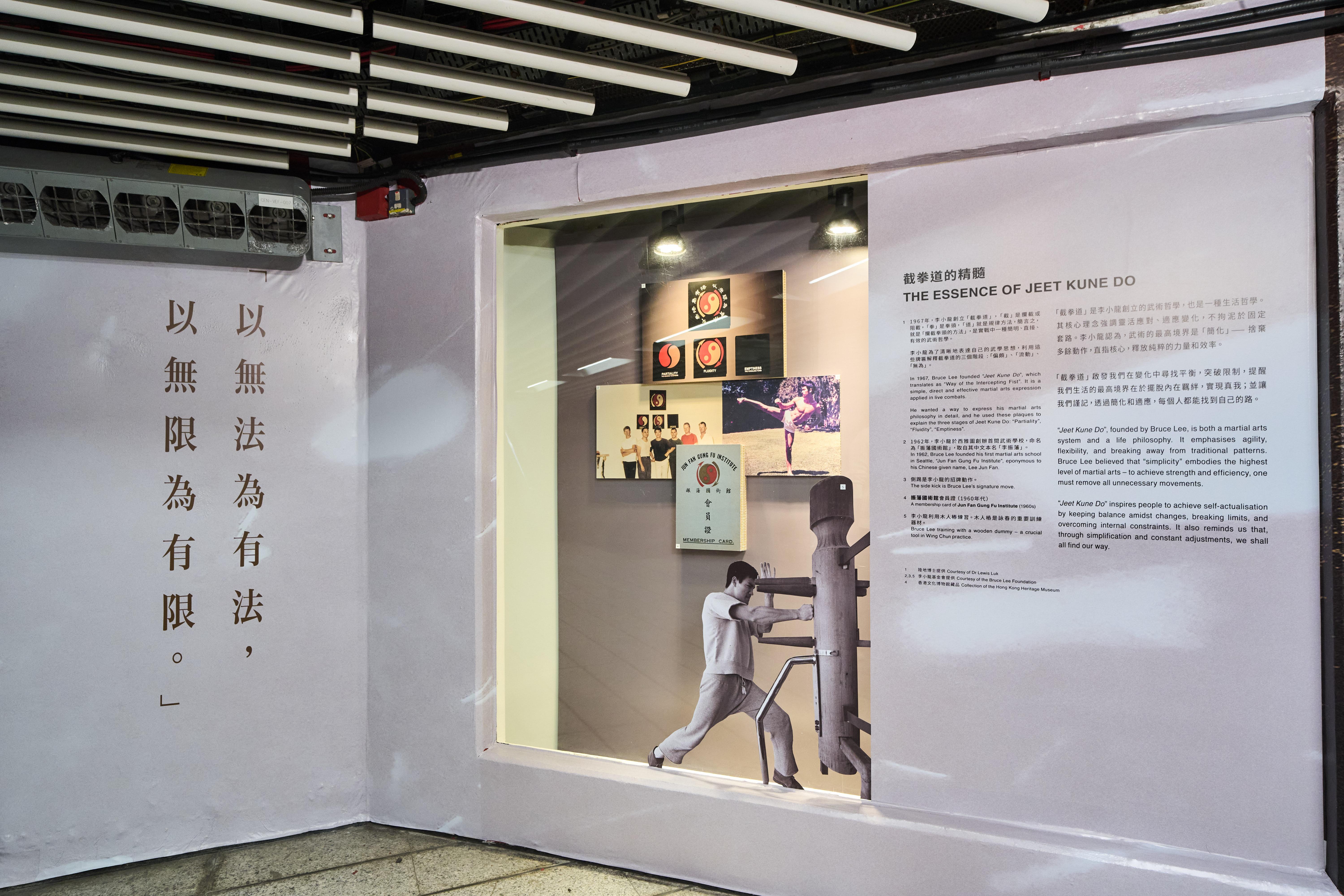 展覽分為兩部分,分別為香港站的「港鐵藝術舞臺」互動體驗展區及中環站J出口的「港鐵‧藝術」展廊主題特展。香港站展區以電影、武術、哲學及藝術四大方向,讓觀眾感受李小龍「以無法為有法」的哲學思維。《龍影‧哲思》雙面藝術牆和1:1彩色矽膠半身像同樣以李小龍經典姿勢為創作藍本;「以龍共武」互動攝影裝置及「哲學對話亭」帶領粉絲進入巨星世界,與他合照之餘,更能聆聽李小龍的哲學觀點。