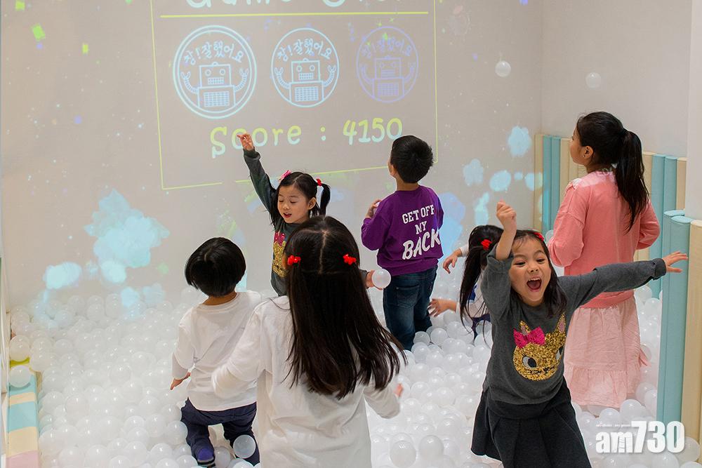 結合投影計分遊戲的雪白波波池,小朋友爬上繩網後經過滑梯,衝進波波池,向牆上的計分投影遊戲投擲波波。